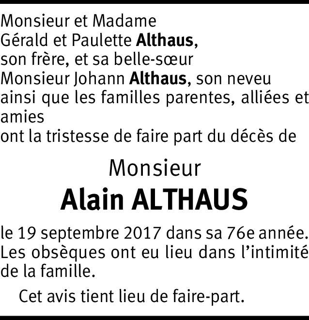 C'est avec beaucoup de peine que j'ai appris le décès d'Alain, dont je garderai un bon souvenir de notre jeunesse à la rue du Valais... Sincèrement.