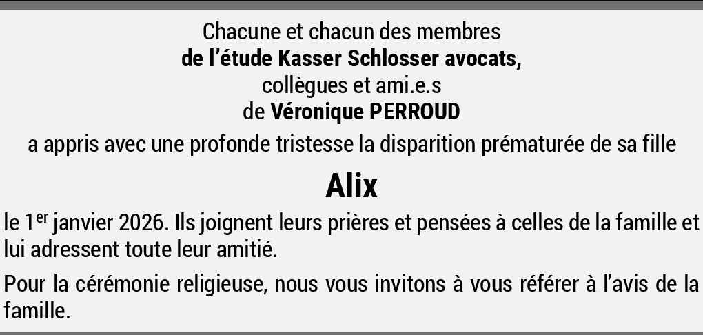 Mes prières et mes pensées vous accompagnent dans la terrible épreuve que vous vivez. Je vous adresse mes sincères condoléances pour le départ prématuré d'Alix. Elle et tous ces jeunes frappés par le drame de Crans resteront dans nos cœurs.