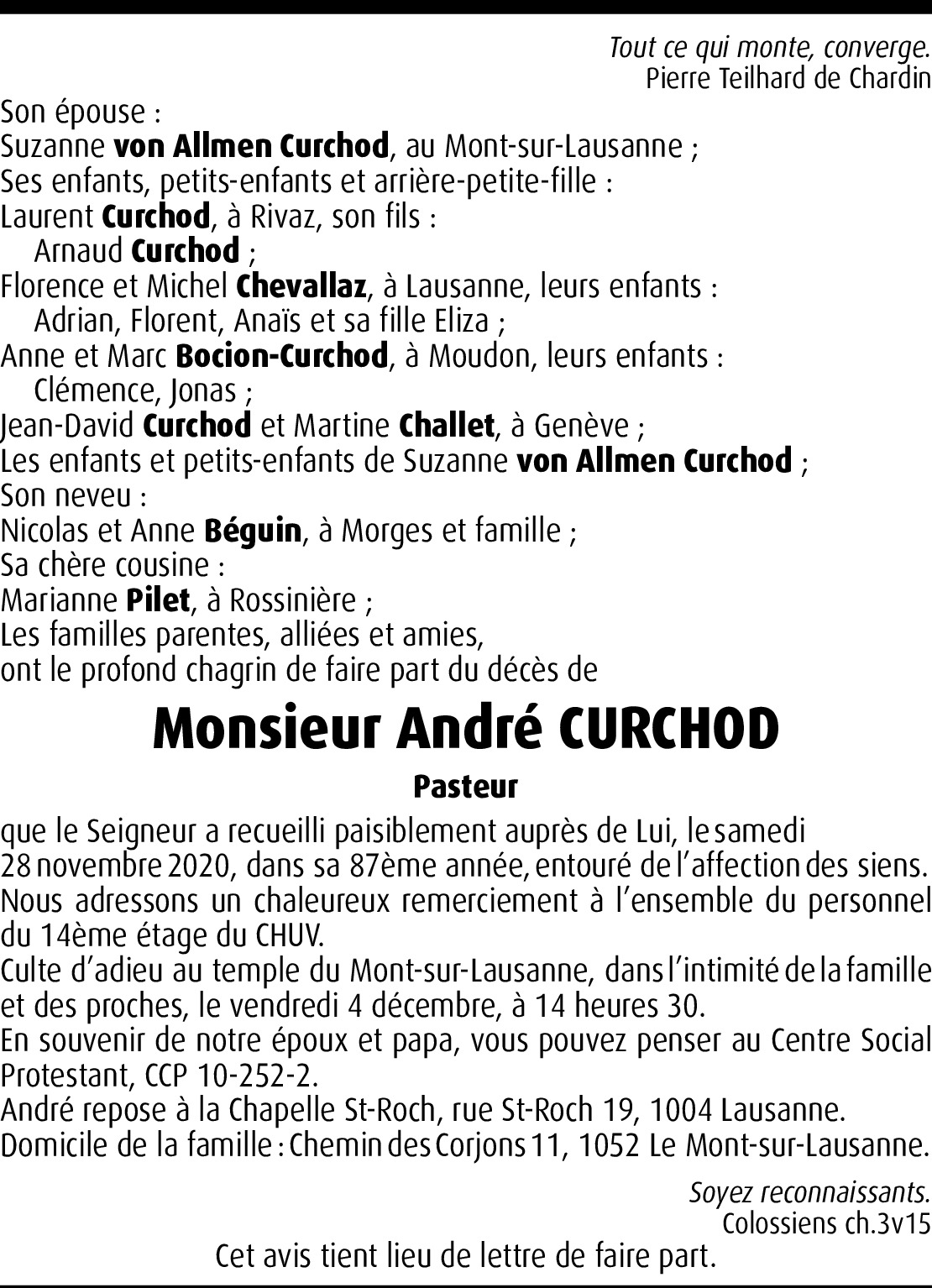 Vor mehr als 4 Jahren Melden Chère Famille, nous sommes en pensées avec vous en ces moments pénibles et nous vous présentons nos sincères condoléances. Von Jean-François Chappuis