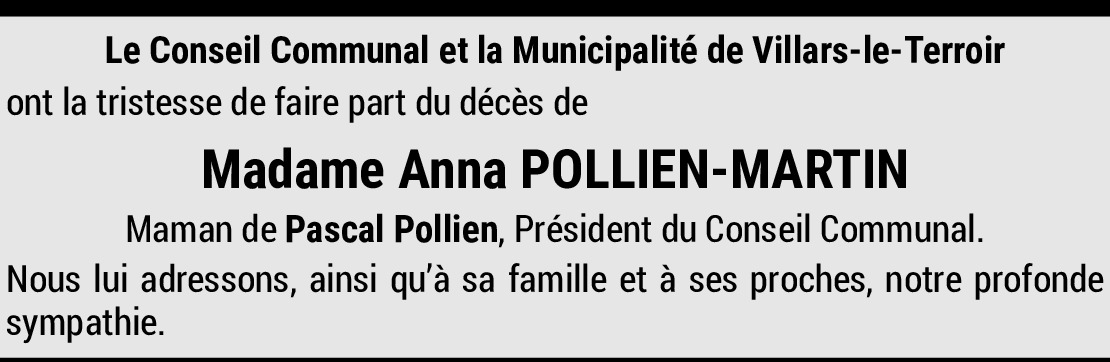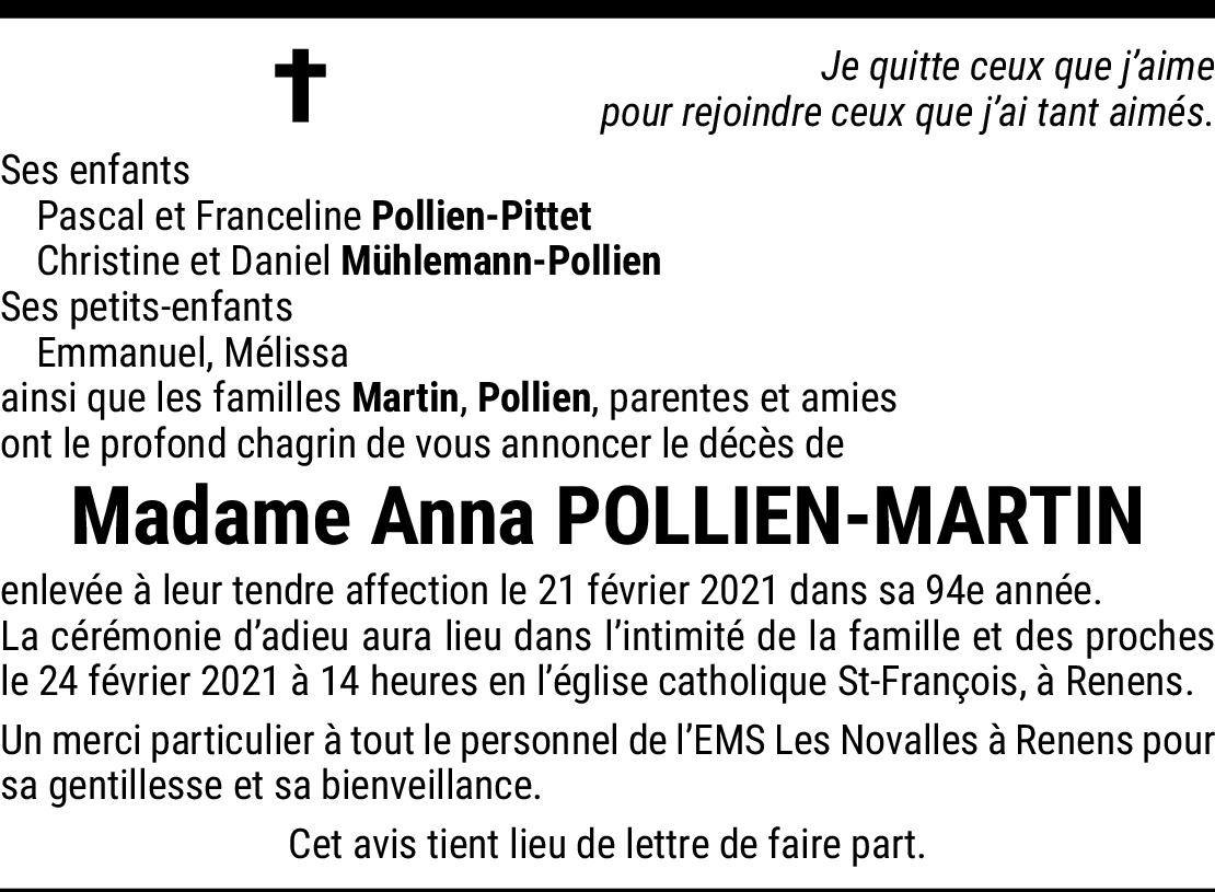 Vor mehr als 4 Jahren Melden J'apprends avec tristesse le décès d'Anna Pollien J'adresse à son fils Pascal, famille et proches, ma profonde sympathie J'ai très bien connu Anna, et en garde le meilleur des souvenirs. Martial Pichonnaz Von Martial Pichonnaz