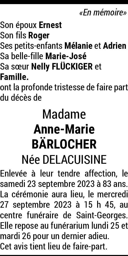 Nous avons appris avec une grande tristesse le décès si abrupte et inattendu d’Anne-Marie, notre chère voisine si avenante et gentille, elle va nous manquer. Nos pensées émues sont également pour Ernest qui n’a jamais manqué une occasion pour être gentil ou complimenter sa chère épouse. La vie est parfois cruelle et injuste, nos sincères condoléances pour ce drame qui frappe votre famille. Karin et Patrick Paggi