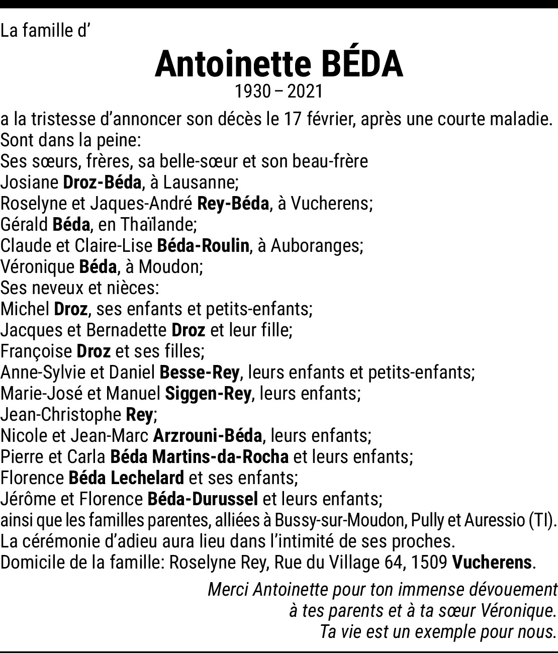 Vor mehr als 4 Jahren Melden Chère Famille, nous sommes en pensées avec vous en ces moments pénibles et nous vous présentons nos sincères condoléances. Von Jean-François Chappuis