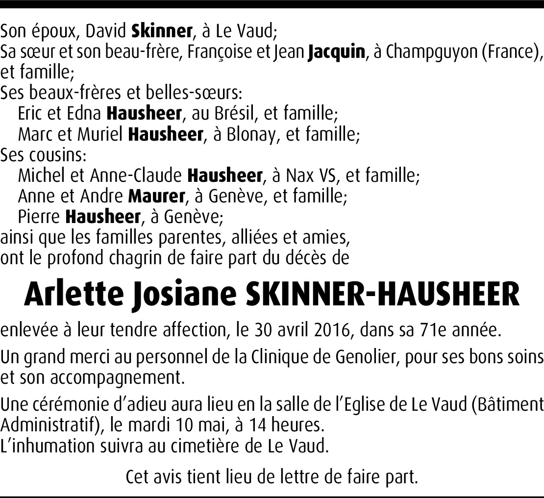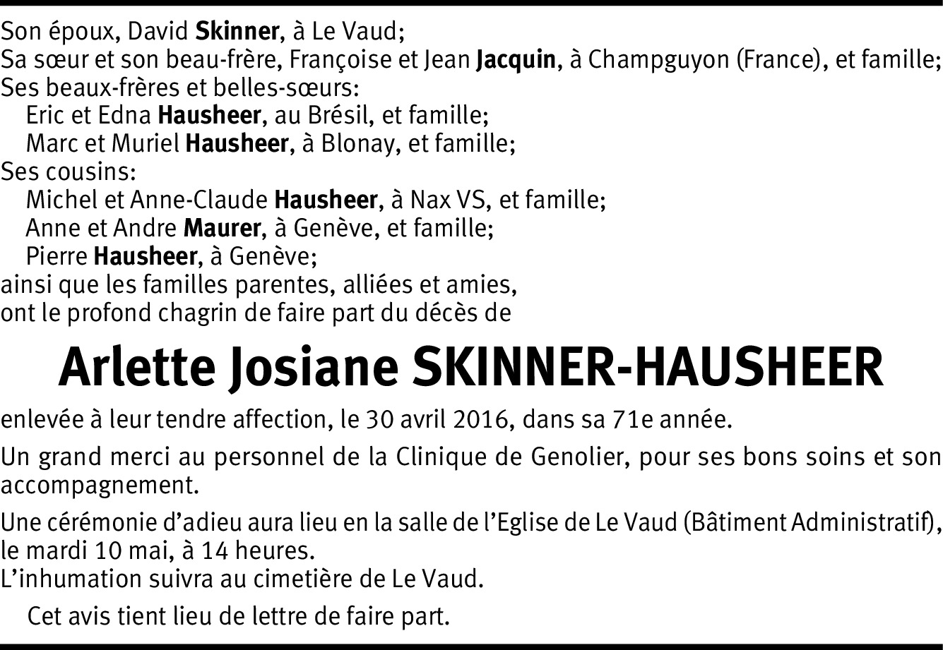 Je vous présente toute ma sympathie pour cette terrible perte. Arlette a été ma collègue de travail à la CEI pendant de nombreuses années, je garderai d'elle un souvenir très amical. Nous l'aimions beaucoup.
