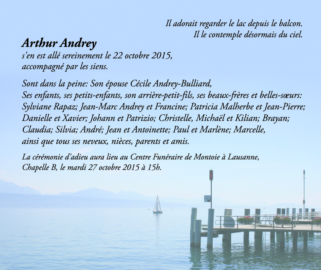 Une grande tristesse mêlée de nostalgie pour tout ce qui fût mon enfance, lui qui était mon oncle Arthur et avait su garder son âme d'enfant et comprenait si bien ses neveux. Enthousiaste et chaleureux, généreux, le seul oncle qui a enchanté ces jours de fêtes familiales, dont il ne reste maintenant que la nostalgie, à jamais gravée dans mon cœur. Merci Arthur pour avoir enchanté ma jeunesse. Et que toute cette joie donnée te soit rendue à tout jamais.
