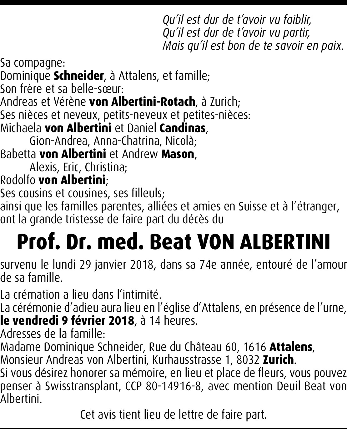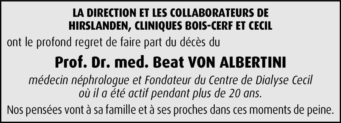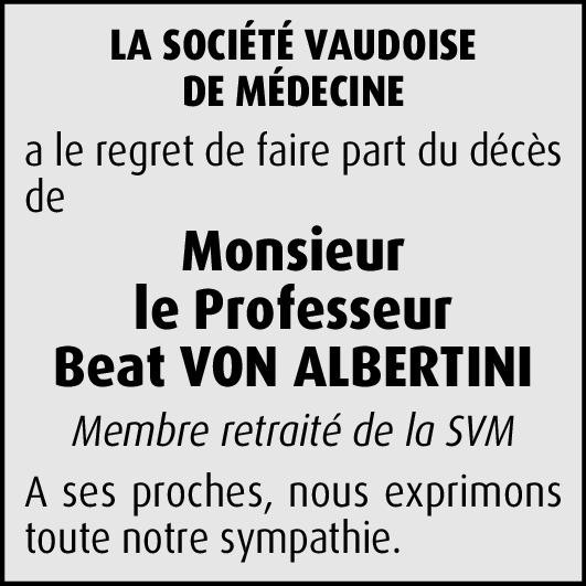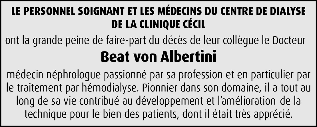 With great regret and sympathy, we heard on the passing of Prof. von Albertini. On behalf of the European Society for Artificial Organs, I would like to send to you and his family our sincere condolences. He was an early member of our society, in which he was very active and highly appreciated for his work on hemodialysis and hemofiltration making great contributions to this field. It is a great loss for science and medicine and for the European Society for Artificial Organs, too.