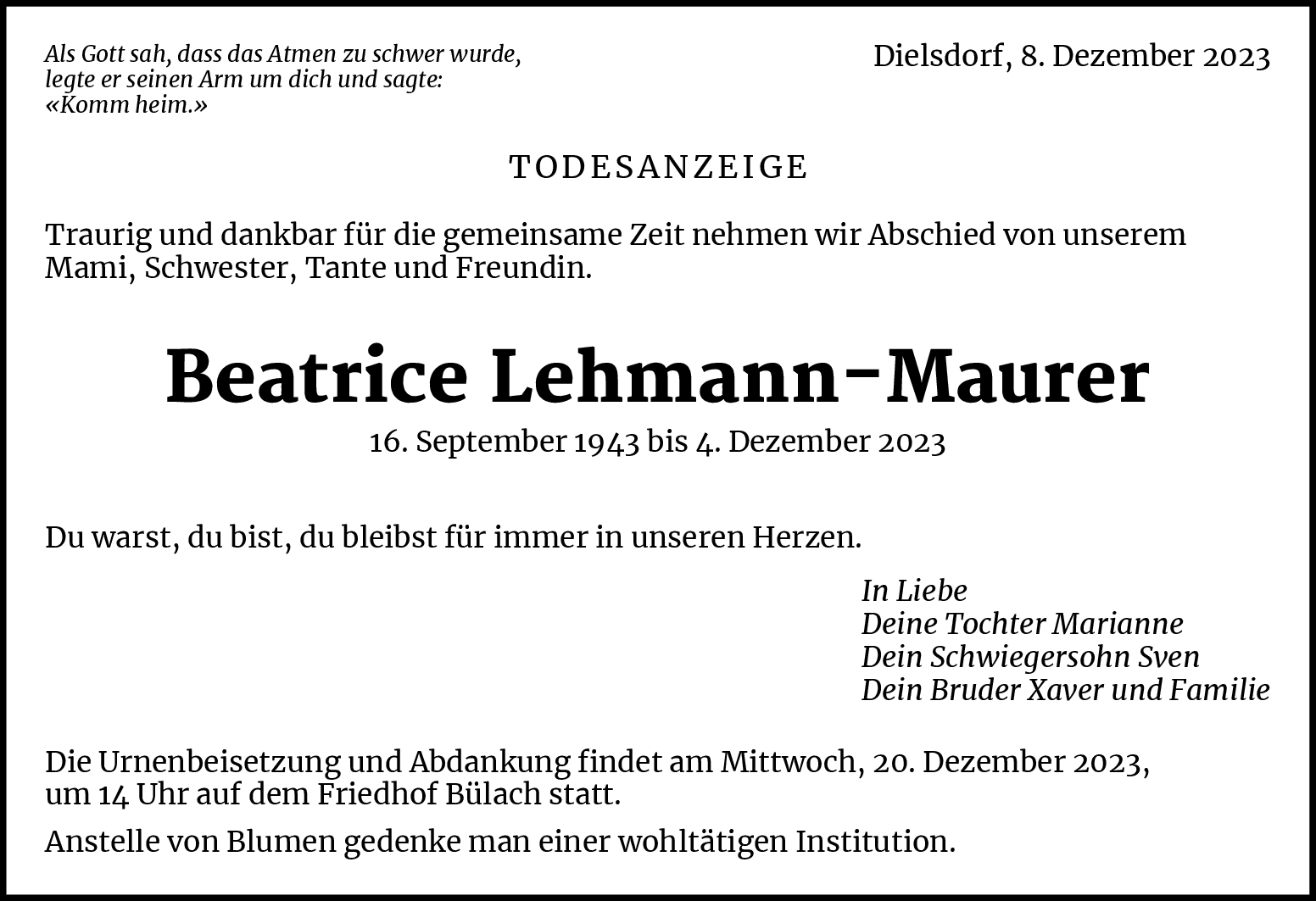 Möchten Sie über neue Todesanzeigen und Kondolenzen für diesen Verstorbenen informiert werden?