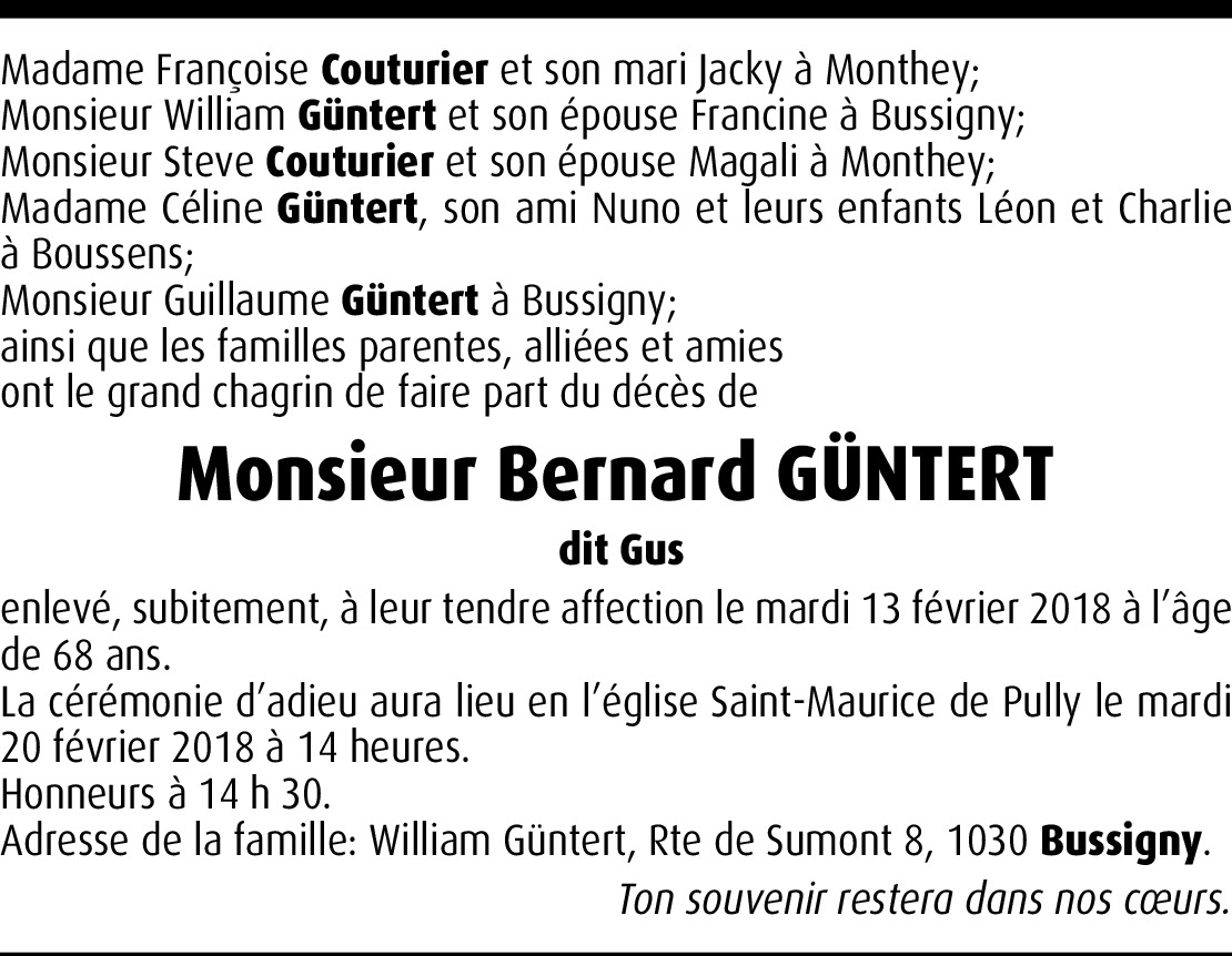 Vor mehr als 4 Jahren Melden Les copropriétaires de la PPE Arnier 18 à Belmont s'unissent pour souhaiter leurs sincères condoléances à la famille de Bernard, notre administrateur depuis de nombreuses années. Von Jacky Détraz