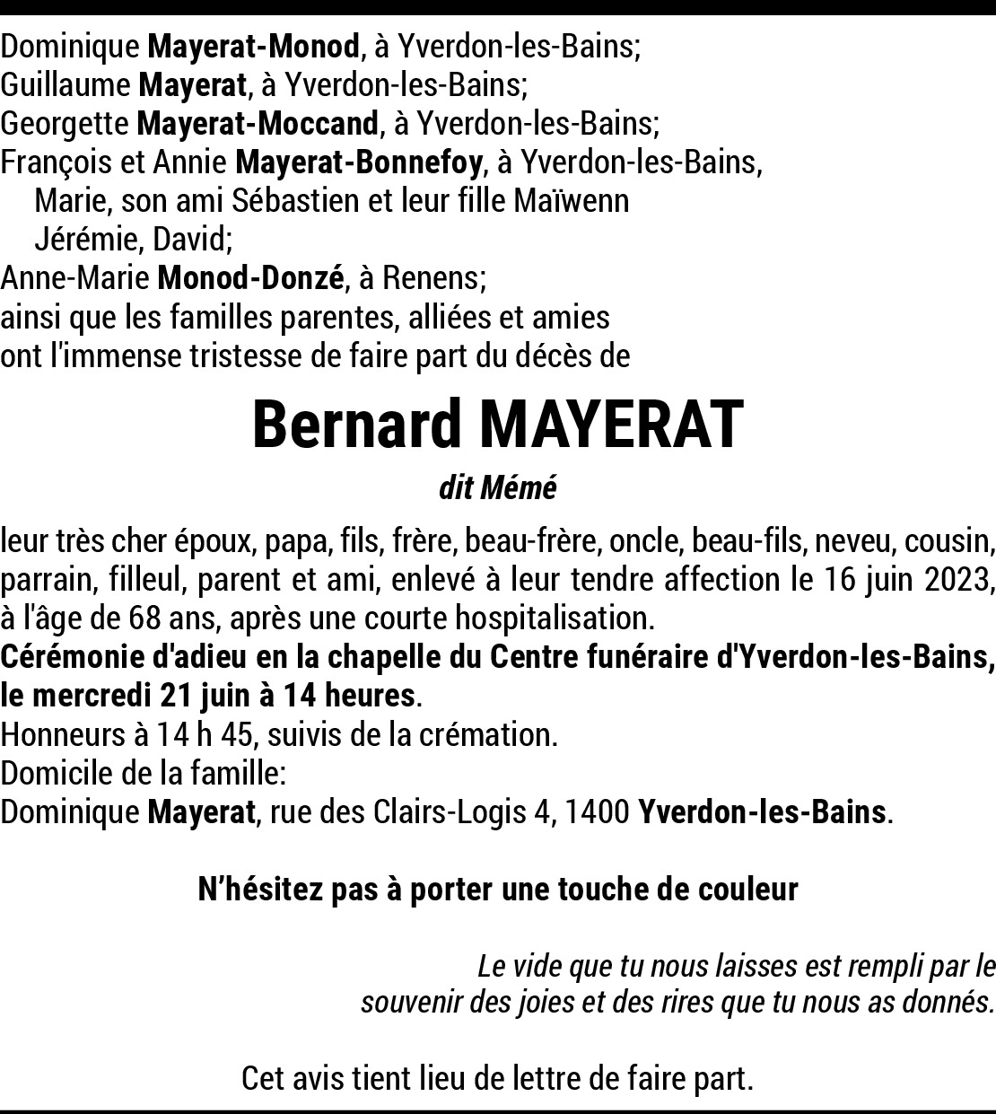 21.06.2023 Melden Je vous adresse mes plus sincères condoléances en ce moment de deuil et vous témoigne toute ma sympathie et mon soutien. Von Matthey