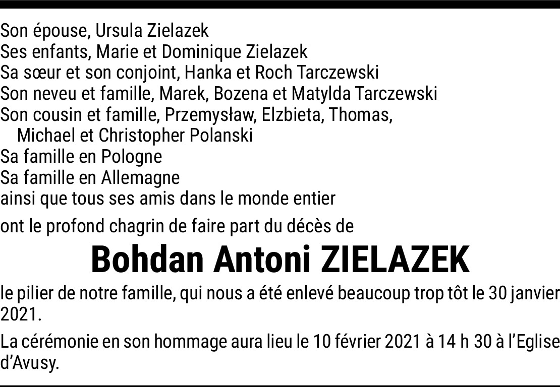 Vor mehr als 4 Jahren Melden Chère famille, Je vous adresse toutes mes sincères condoléances suite au départ de Bohdan... Je vous souhaite de trouver la force de la sérénité. Une ancienne collègue de Bohdan Von Françoise Muller