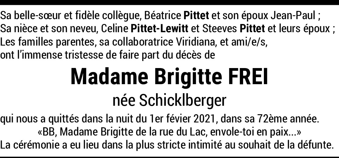 Vor mehr als 4 Jahren Melden C'est avec beaucoup d'émotions que j'apprends ce jour le décès de Brigitte. Que sa famille reçoivent mes plus sincères condoléances. Barbara Von Barbara Grisetti
