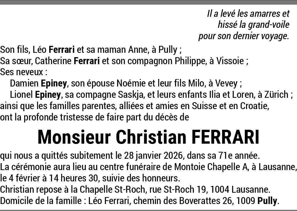 31.01.2026 Melden En pensées avec vous tous pendant ces moments douloureux. Sincères condoléances, amitiés. Von Françoise