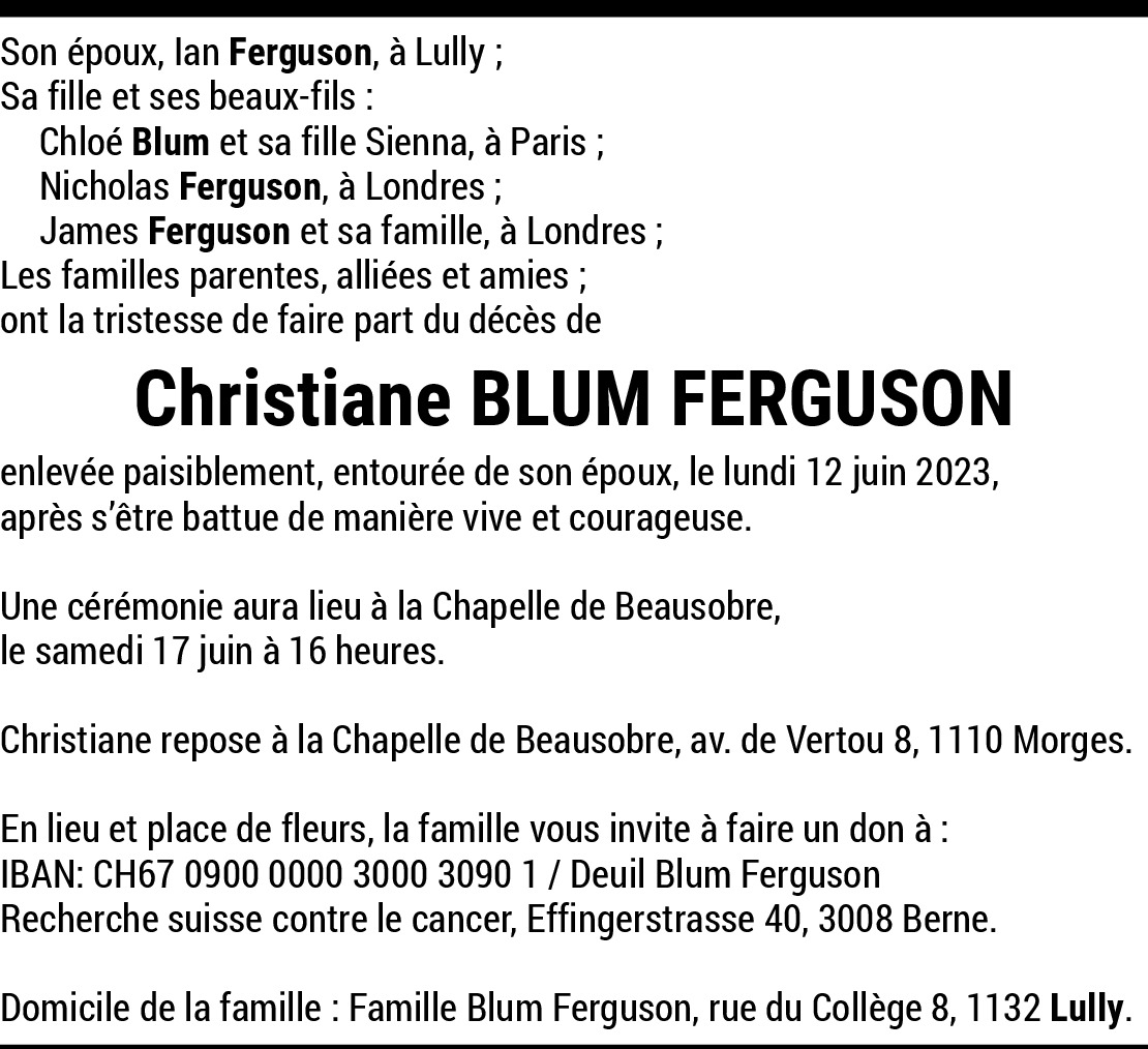 14.06.2023 Melden My deepest sympathy to you Ian and to your family. Christiane was an extraordinary woman, I have many fond memories of her. She is now at peace. Von Garbani