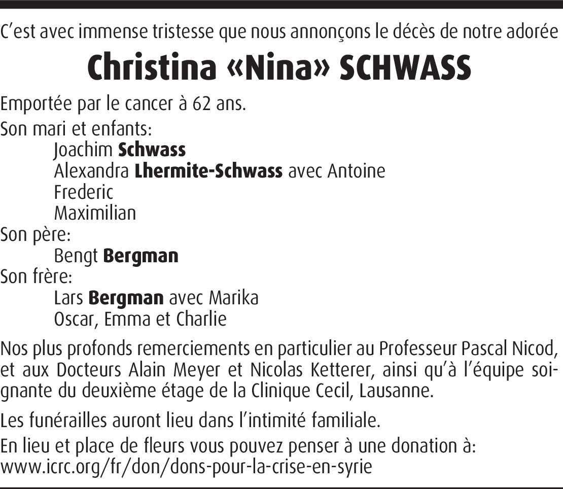 Vor mehr als 4 Jahren Melden In Gedanken an die ganze Familie und unendlich traurig. Nina war eine so unkomplizierte, offene, liebe Frau. Ihre rauchige Stimme mit dem schwedischen Akzent werde ich nie vergessen. Sie war ein Engel und bleibt bei Euch als Engel. Alles Liebe Tina Von Tina Ausoni