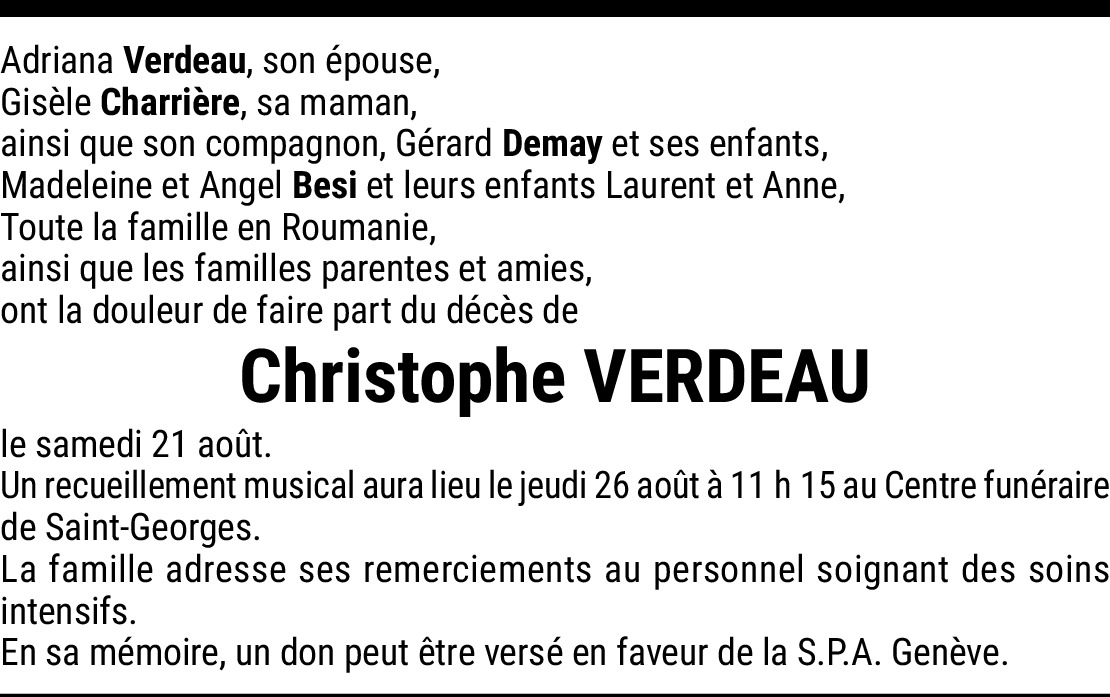 24.08.2021 Melden C’est avec grande tristesse que j’ai appris le décès de Christophe Je suis de tout cœur avec sa maman et avec toi Adriana ,je serais avec vous en pensée Courage et gros bisous Von Pallas Gonzalez
