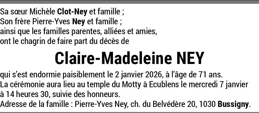 En cette période où normalement on reçoit des vœux de santé et bonheur, voilà que la nouvelle claque comme un coup de fouet. Ma relation un peu particulière avec votre famille à l’époque de ma scolarité, m’a permis de côtoyer vos parents et de connaître Claire-Madeleine un peu plus que comme copine de classe. De tous je garderai un très bon souvenir qui restera indéfectible.