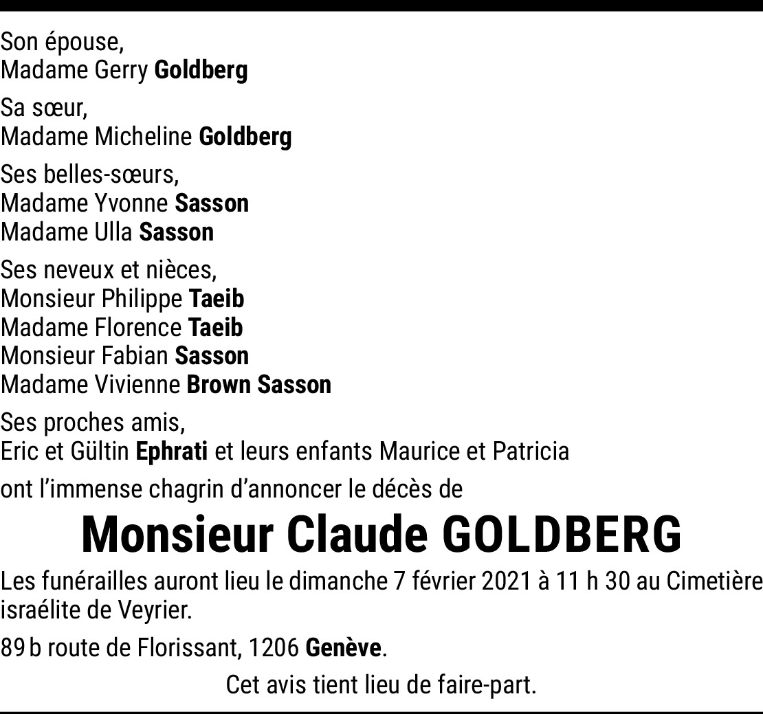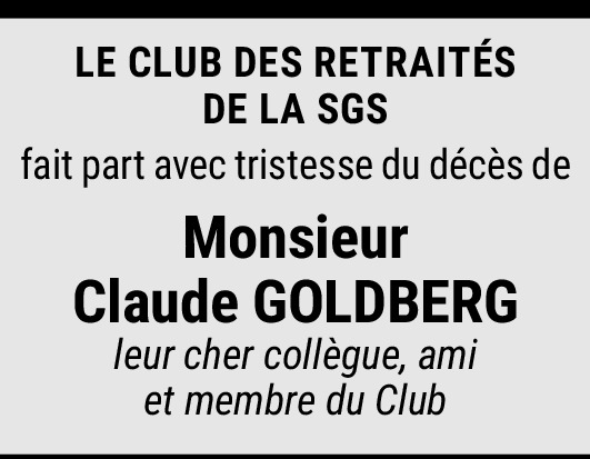 Je vous présente mes plus sincères condoléances ainsi qu'à toute votre famille. Durant mes 30 années à la SGS, j'ai beaucoup collaboré avec Mr Goldberg, dont je garde le souvenir d'un chef foncièrement droit et très humain. Avec toute mon affection à vous et à votre famille. Mes pensées vous accompagnent dans l'épreuve que vous traversez.