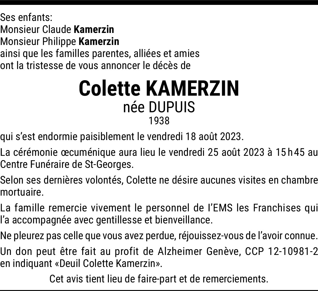 Au revoir tata Colette, merci pour ton hospitalité (quand tu as hébergé ta famille au retour des Etats-Unis, et moi aussi une fois quand je suis arrivé à l'improviste chez toi après un long voyage). Je me rappelle encore avoir joué sur la route de Vernier près de votre bel appartement presque à la campagne Genevoise. Je suis triste de n'avoir pas pu te visiter, et voir Claude et Philippe, les trois dernières années, mais je te remercie encore pour tous les bons souvenirs, et les dîners à la Cité Vieusseux. Je pense bien à toi.