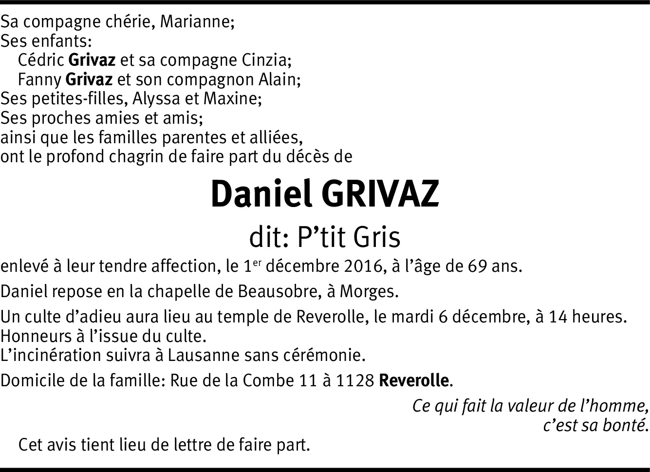 Nous savons que vous êtes durement éprouvés par la perte d'un être aimé. En ces heures sombres de votre vie, vous êtes dans toutes nos pensées. Espérant que le temps effacera lentement la douleur et illuminera en votre cœur le souvenir des bons moments.