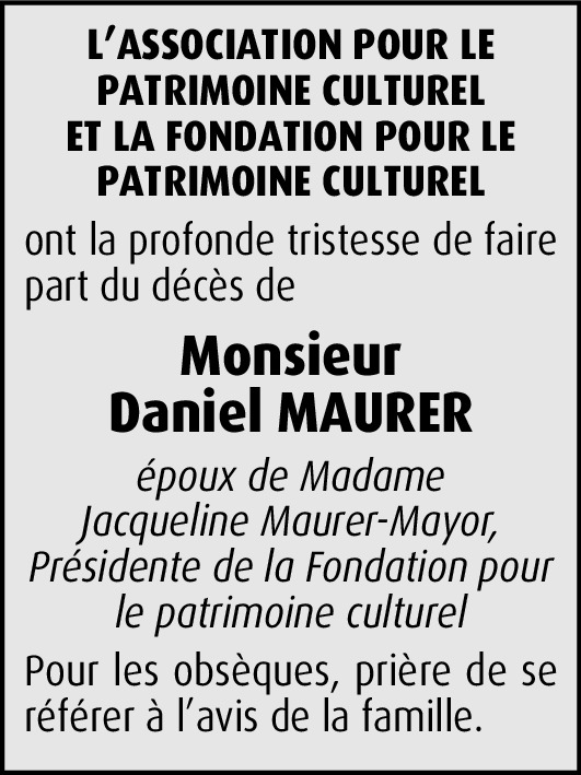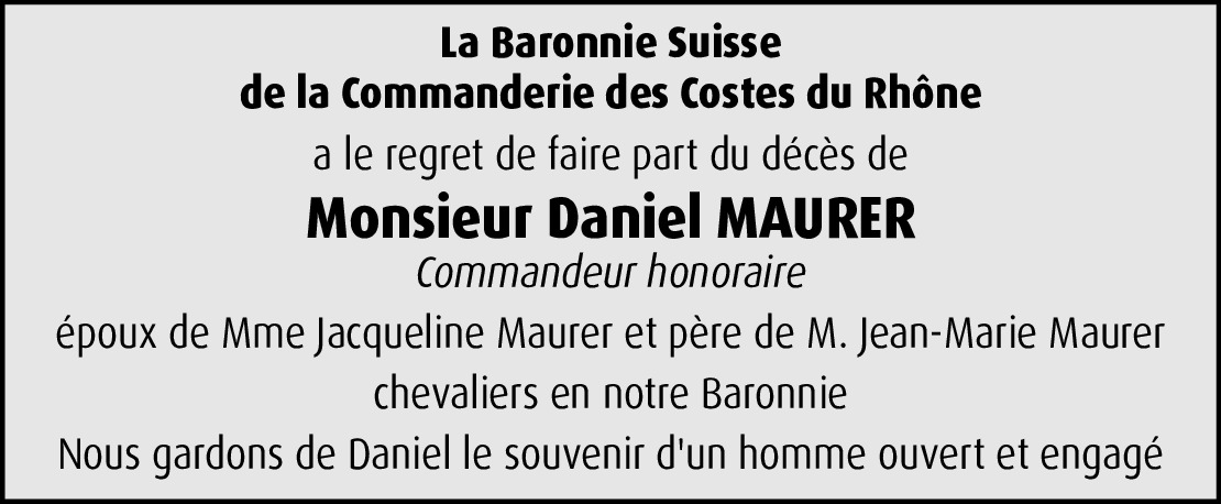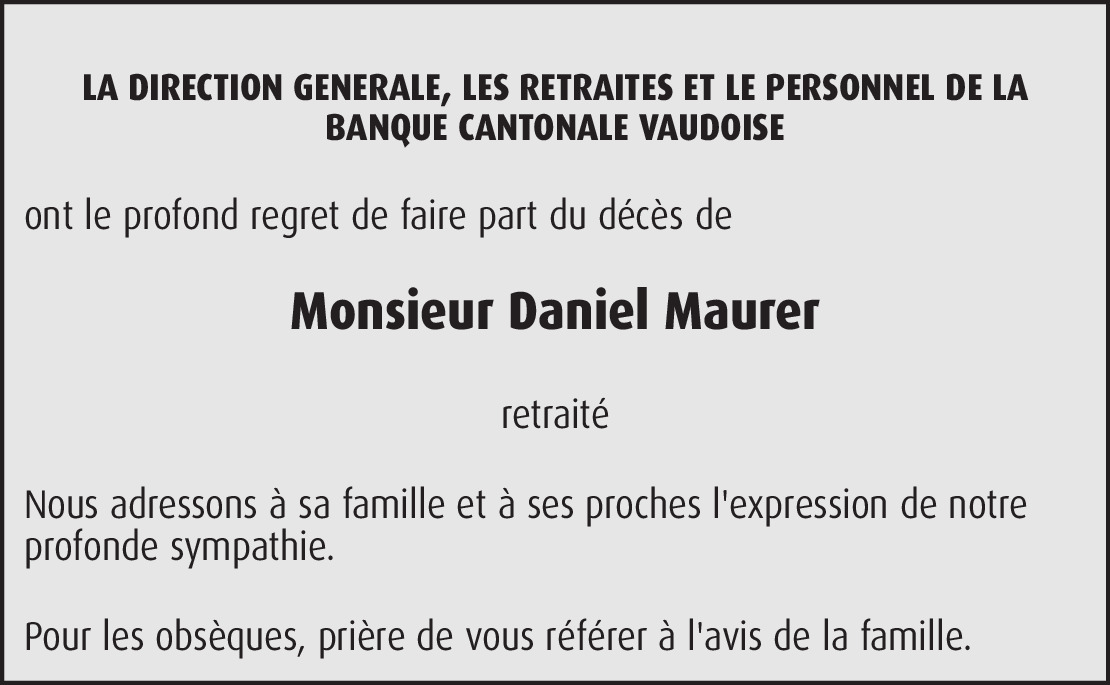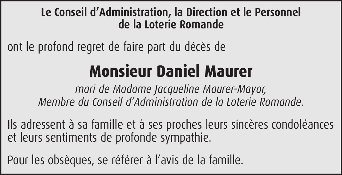 Chère Madame, c'est avec tristesse que j'ai appris le décès de votre mari, M. Daniel Maurer. En ce moment de deuil, je vous adresse, chère Madame, un message de profonde empathie ainsi que mes salutations distinguées.