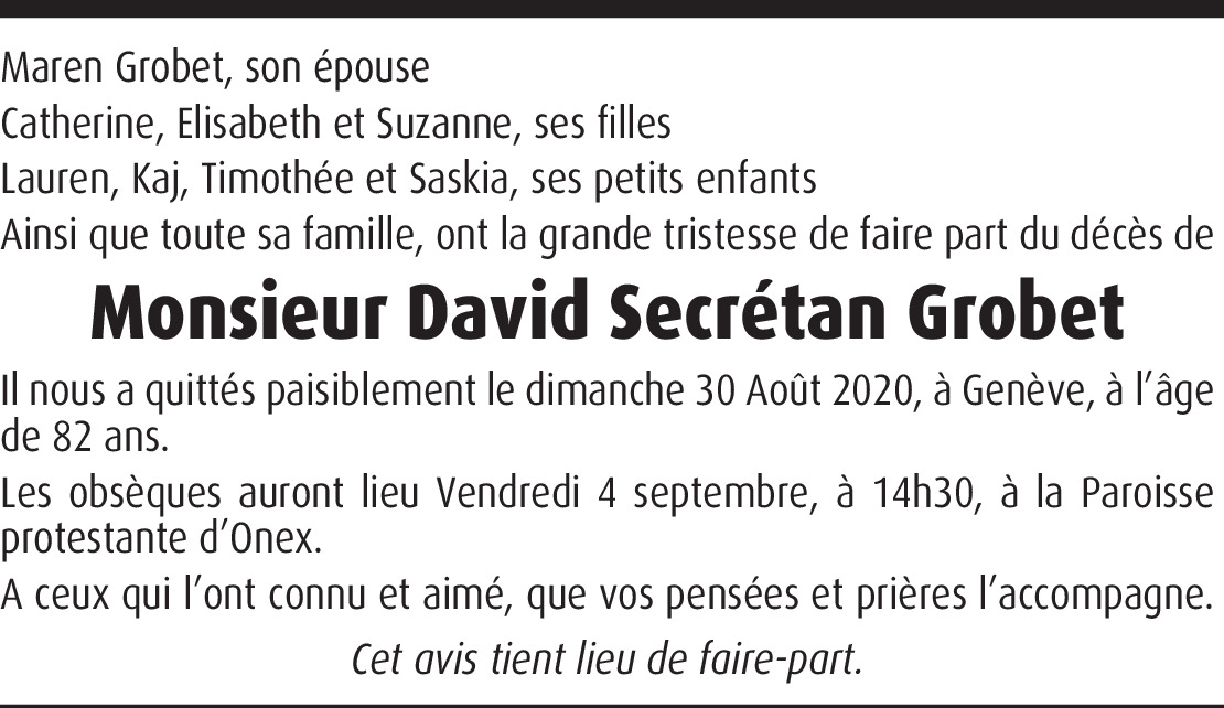 J'ai appris la nouvelle hier soir par mon père qui n'avait pas songé à m'informer avant. J'en suis désolé et aurais voulu venir hier en personne. J'ai essayé de vous joindre par téléphone à la maison, mais sans succès. Je suis joignable au 079 278 13 26 en espérant que nous pourrons nous parler. En attendant je vous envoie toutes mes pensées affectueuses pour vous accompagner dans cette difficile épreuve.