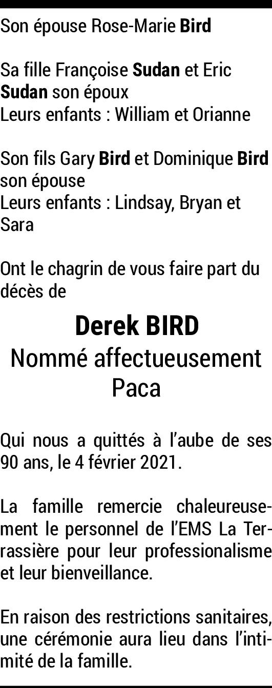 Chère Rose-Marie, chère Françoise, cher Gary, de tout cœur avec vous dans ce moment difficile. Je garderai un souvenir ému de Derek, qui a accepté de jouer auprès de moi le rôle de parrain de substition quand mon parrain a choisi quand j'avais 4 ans qu'il n'avait plus aucun rôle à jouer auprès de moi. Je vous embrasse très fort.