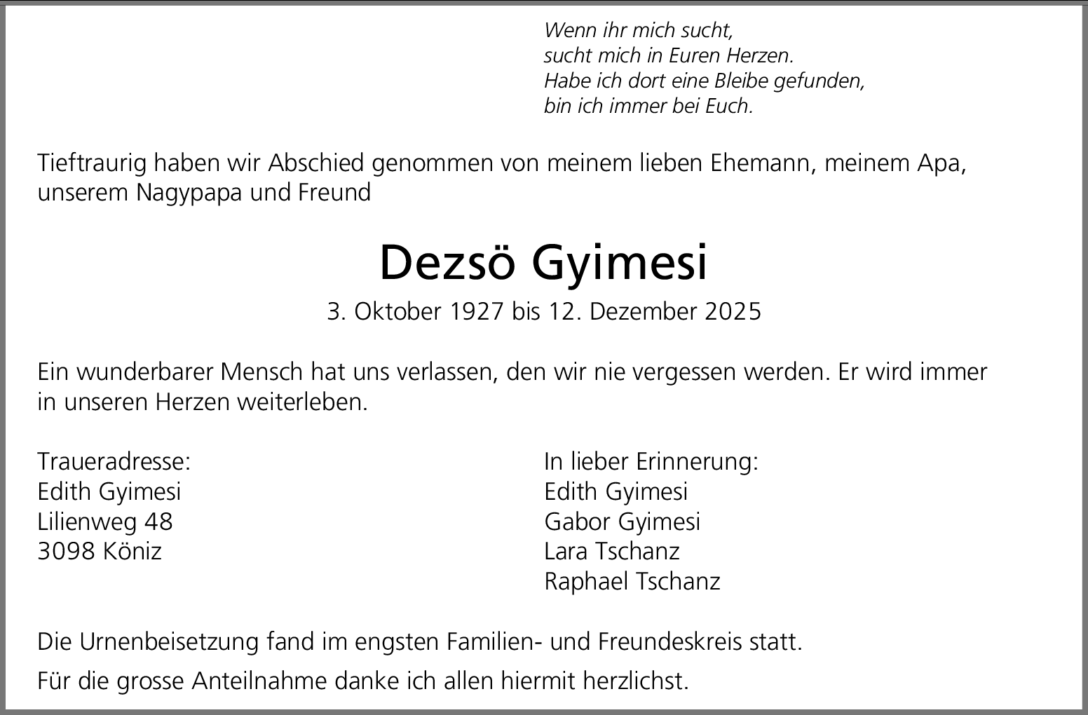 Möchten Sie über neue Todesanzeigen und Kondolenzen für diesen Verstorbenen informiert werden?