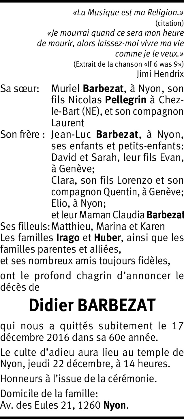 Nous sommes très peinés de perdre si subitement nôtre amis Didier Barbezat, tant apprécié de ses amis, nous sommes en pensées avec sa famille. Ses amis de Vernier