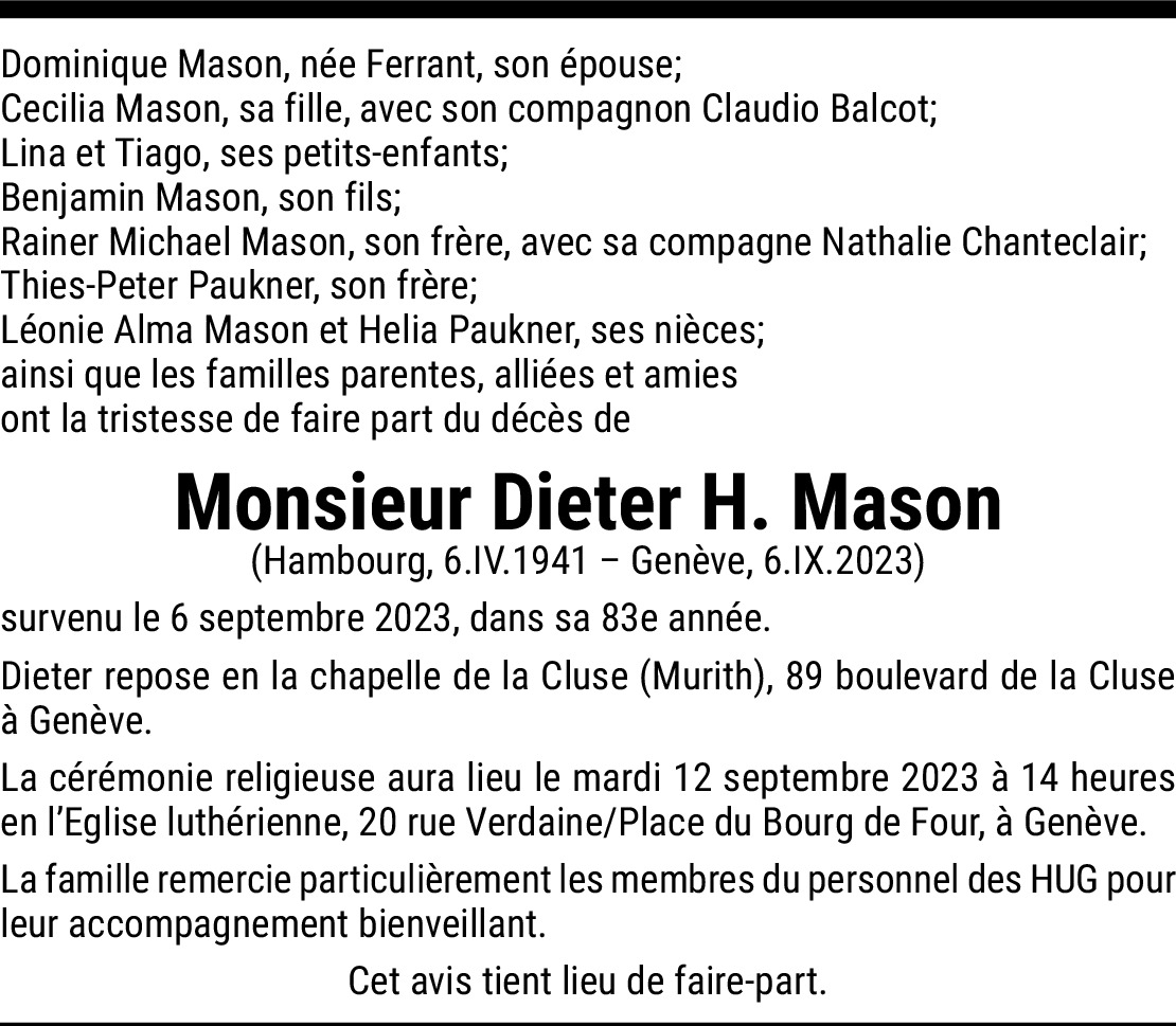 Camarade d' école à Puplinge Dieter se distinguait par se gentillesse et sa droiture . Il laisse le souvenir d'un garçon aimable et courtois. Toute ma sympathie à ses proches.