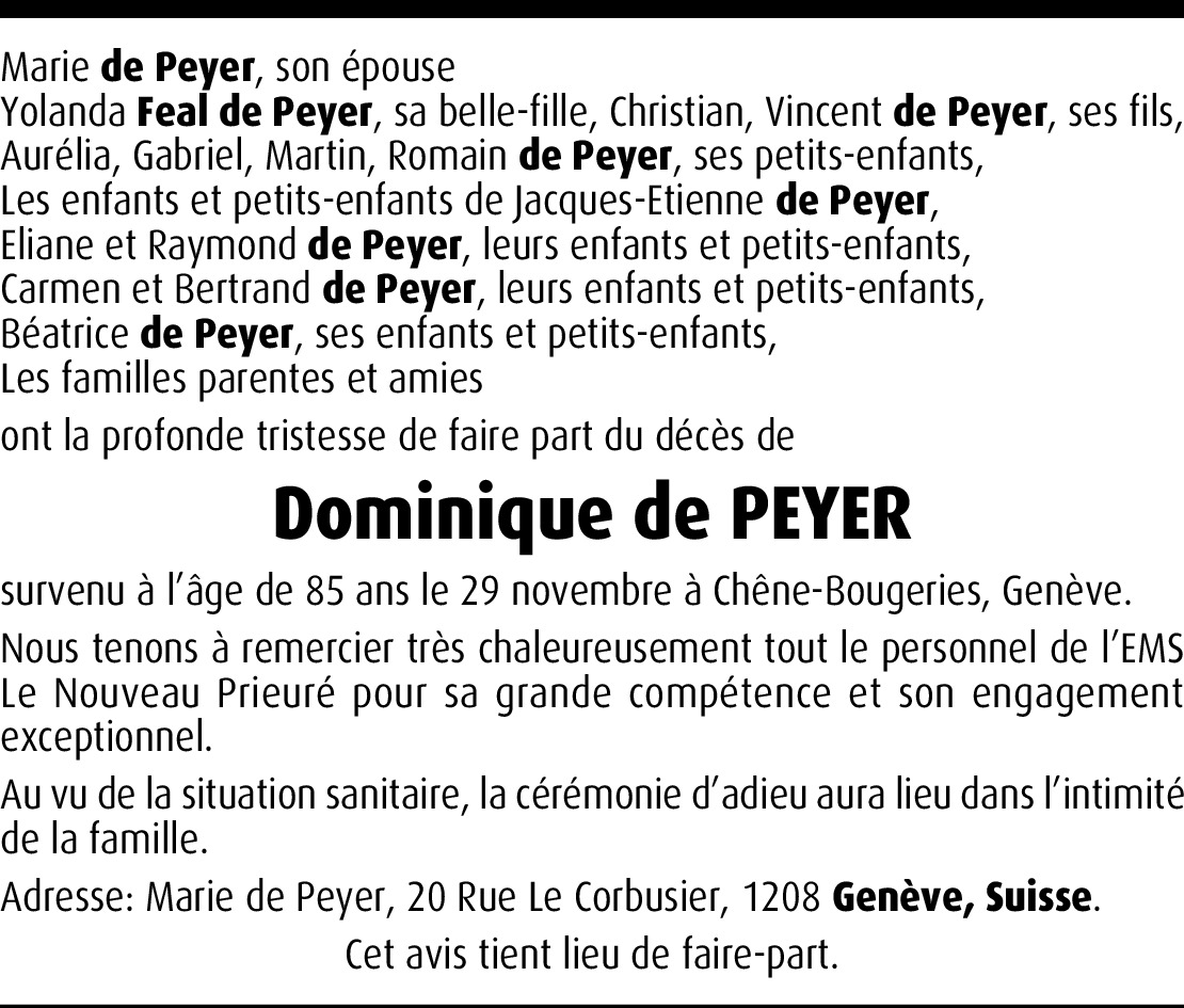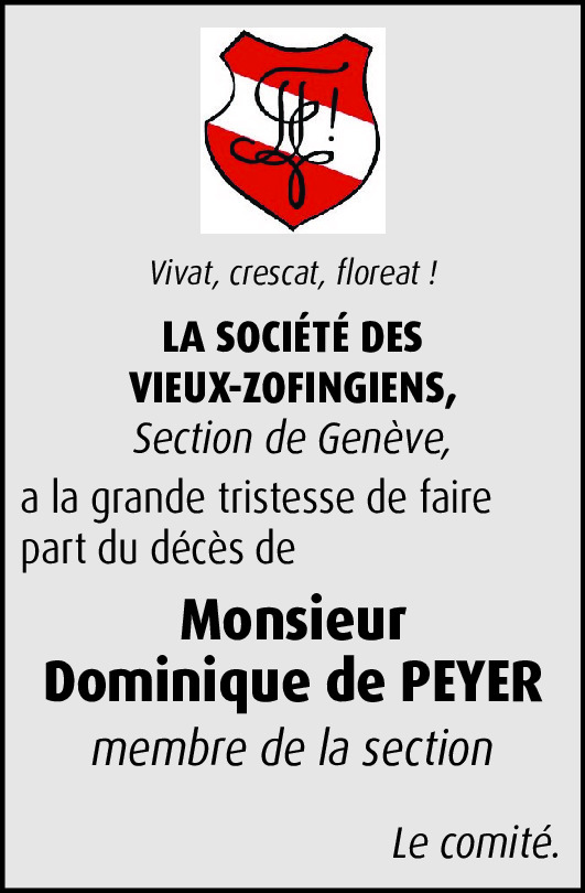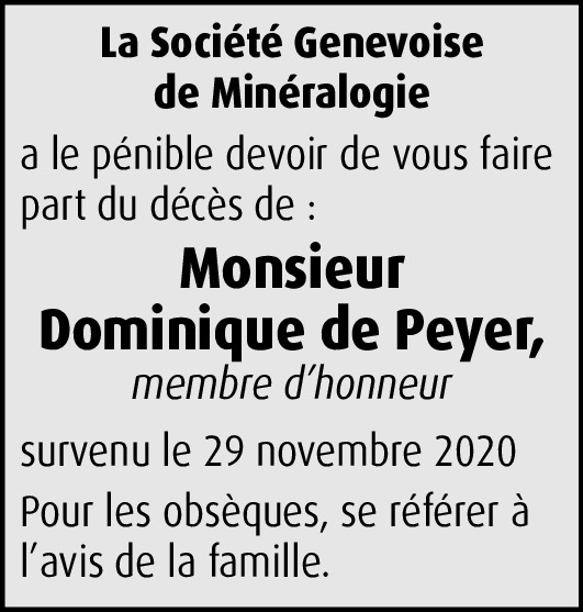 Profondément ému par la disparition de Dominique, inestimable compagnon d'aventures minéralogiques, j'adresse toute ma sympathie à la famille de Peyer pendant ces douloureux moments. De magnifiques souvenirs de sorties ou de bourses aux minéraux me reviennent en mémoire. Une absence désormais difficile à combler... Avec mon amitié, Cédric Schnyder, membre d'honneur de la Société Genevoise de Minéralogie (SGAM)
