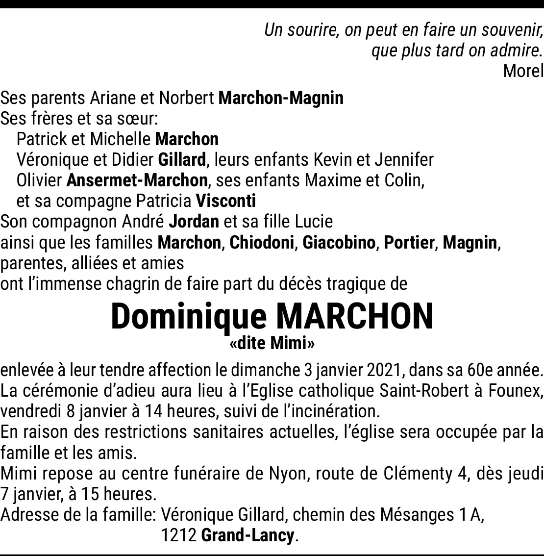 Dominique Marchon était une personne incroyable, douée de nombreuses qualités humaines telles que la générosité, la serviabilité et le don de soi. Elle a été l’une des personnes les plus impliquées et consciencieuses que j’ai connue dans ma profession. Elle va nous manquer.