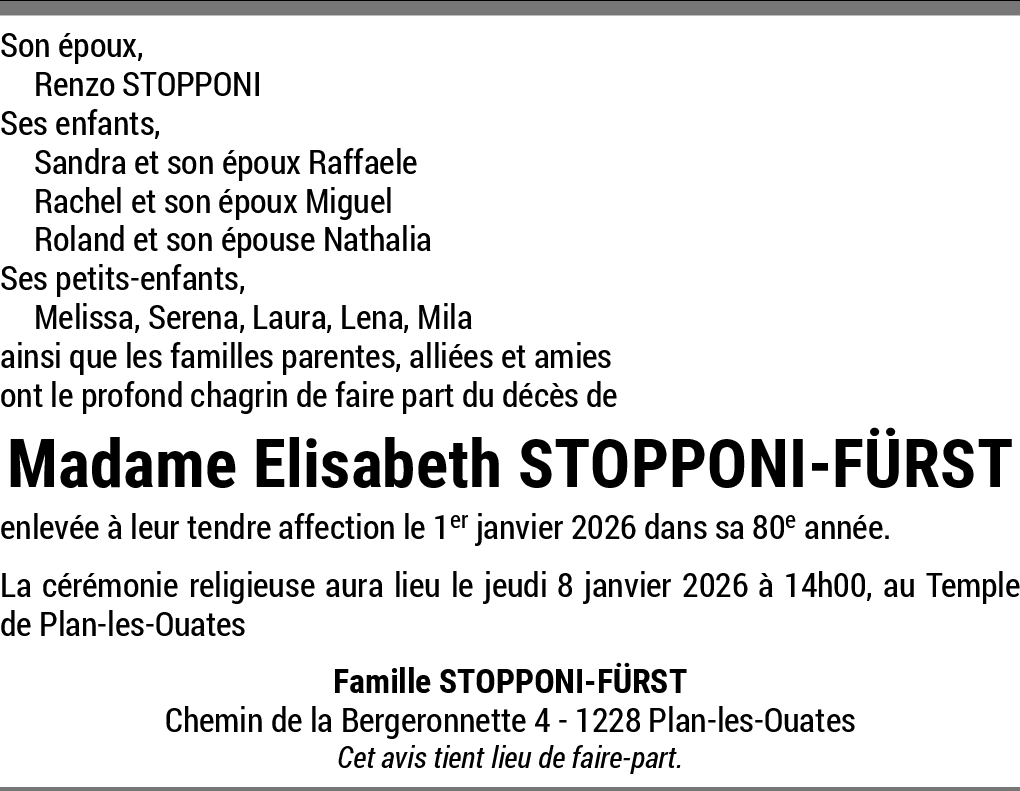 07.01.2026 Melden Avec toutes nos sincères pensées à toute la famille Von Mancini Yvonne et Giancarlo