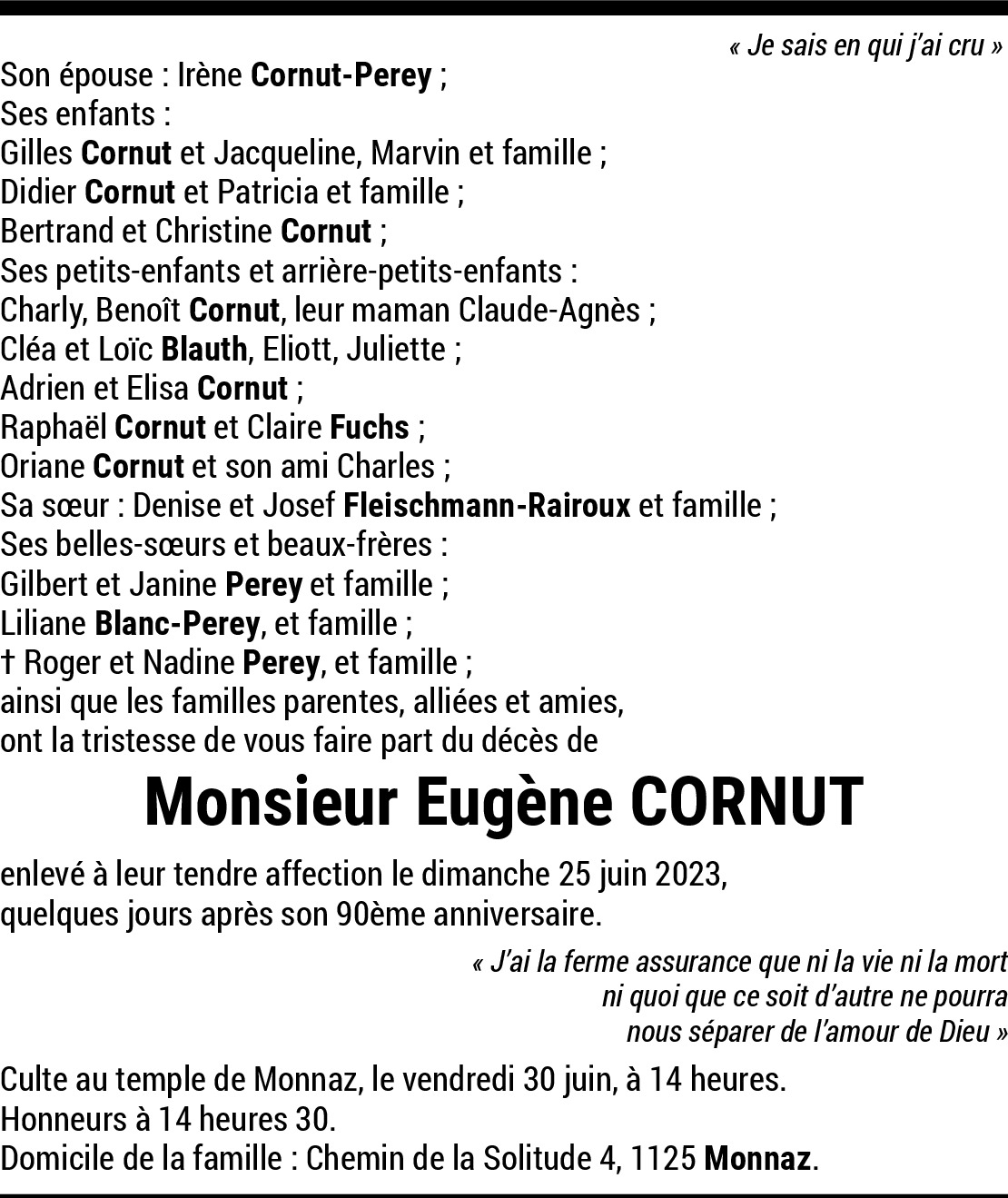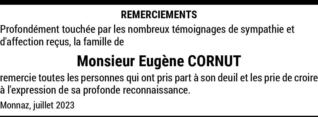 Eugène Cornut était un être d’exception de par une intelligence, une amabilité et une empathie pour autrui hors du commun. Il a été apprécié et admiré par tous ceux qui ont eu la chance de l’approcher et de partager avec lui. Il va beaucoup manquer.