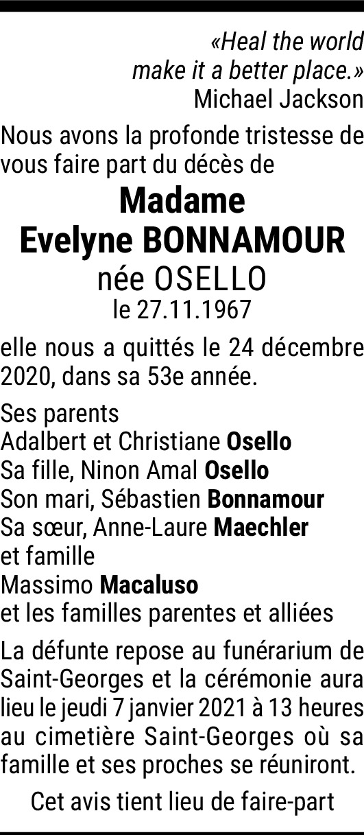 Vor mehr als 4 Jahren Melden Profondément émue d’apprendre le décès d'Evelyne. L’épreuve qui bouleverse votre famille me peine. Je tiens à vous exprimer, dans ces moments de grande tristesse, mes plus sincères condoléances. Von Ingrid Glavich