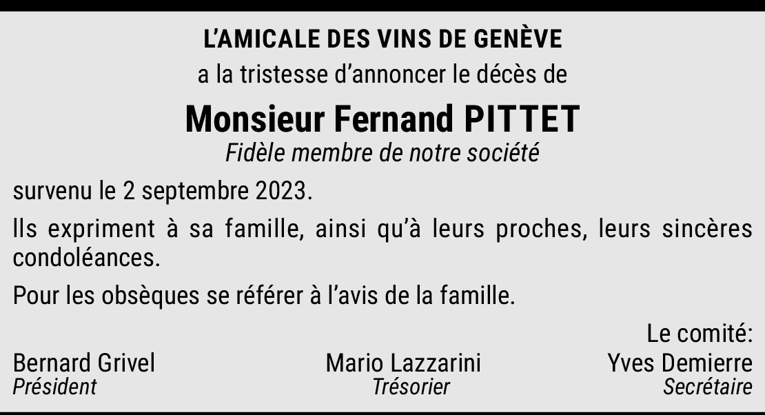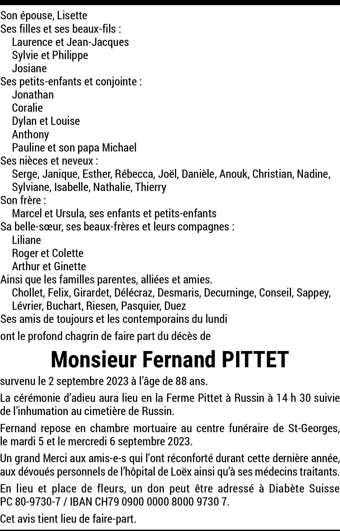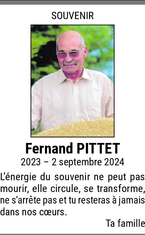 10.09.2023 Melden En pensées avec toute la famille. Fernand était un être exceptionnel, toujours un mot aimable, une parole encourageante. Tu vas nous manquer dimanche 17 septembre prochain. Repose en paix. Condoléances à la famille. Eliane Michaud Ansermet et Patrick Hulliger Von Michaud Ansermet