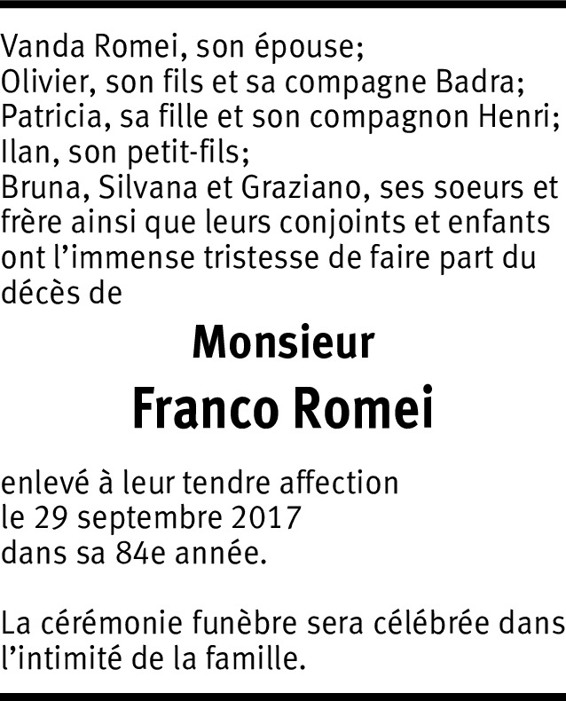 Vor mehr als 4 Jahren Melden Madame Romei, Patricia, Olivier, je vous présente mes plus sincères condoléances. Von Marc Martinez