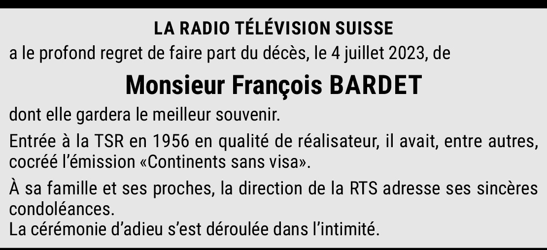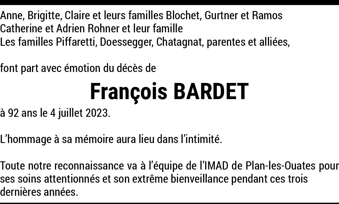 Chères Anne, Brigitte et Claire c'est avec émotion que j'ai appris tardivement le décès de votre Papa. D'un coup me sont revenues les images de vous enfants. La gentillesse que lui et votre maman m'ont témoignée au cours de nombreuses années en m'invitant chez eux et dans leur maison de Fribourg me touche encore, profondément. J'ai passé avec François et Solange des journées empreintes de plaisirs, de joies et d'amitiés partagées inoubliables. Je les en remercie.