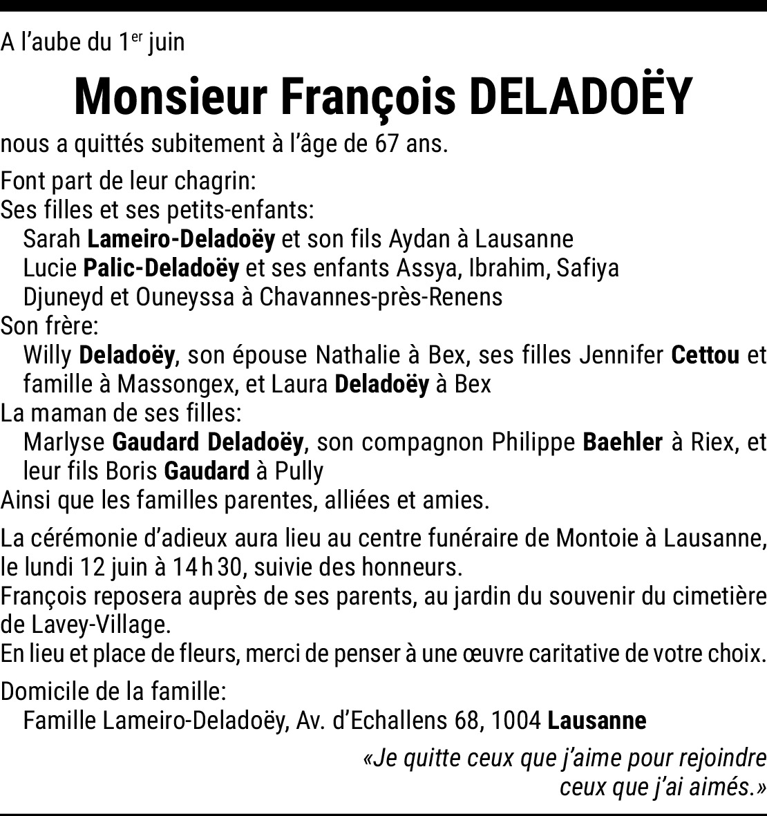 A Sarah et Lucie, à leurs enfants, à Marlyse, je présente mes condoléances les plus sincères.
