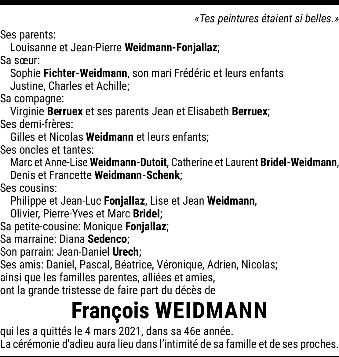Ciao François! Tu nous as laissé pantois à nouveau. Réservé, tu as posé sur le papier des vérités qui nous ont touchés tous. Timide, avec ton humour décapant, tu visais juste. Sensible, tu as su exprimer la violence avec un rare talent. Tu vas juste nous manquer, toi qui pensais que personne ne s’en souciait. Nous t’attendions François, mais ton retour a eu lieu dans l'autre direction, celle où nous, vivants ne sommes pas. Tu as toujours suivi ta voie, la tienne seule. Que la lumière ne t’aveugle et t’emplisse d’amour, enfin! Carmilla ************************* François Weidmann 27 01 1975 - 04 03 2021 Le premier artiste de la galerie Plus de 20 ans de collaboration avec davel 14. En pensée avec ses proches ??