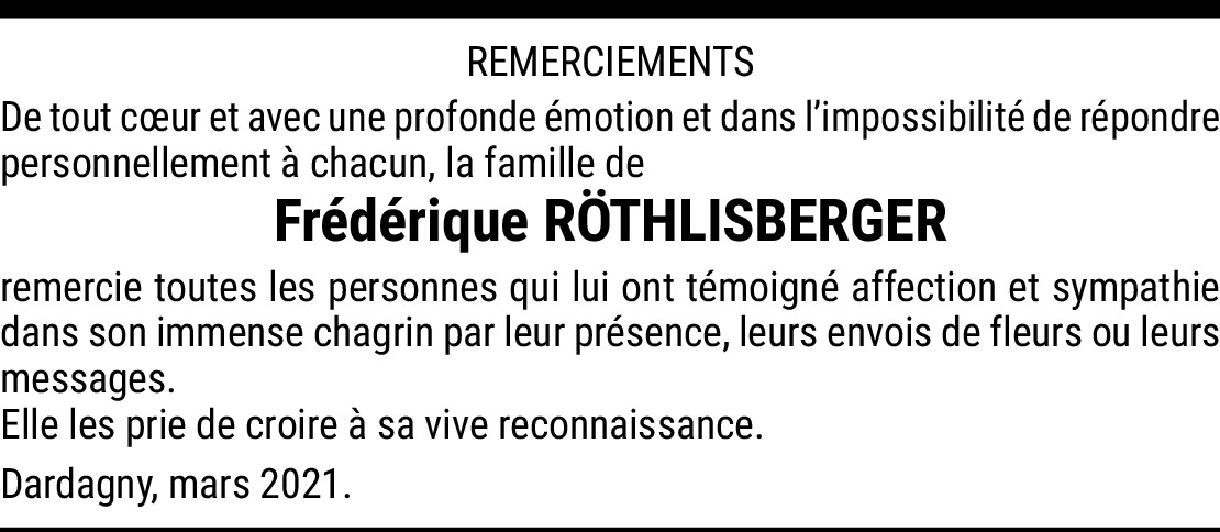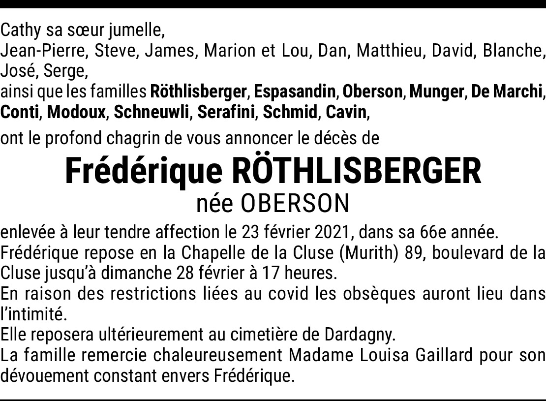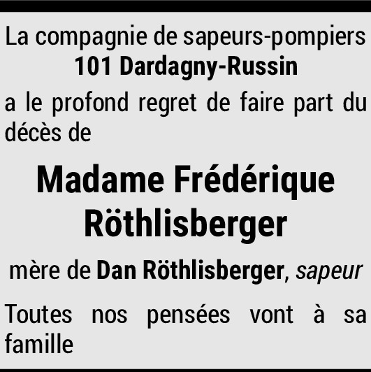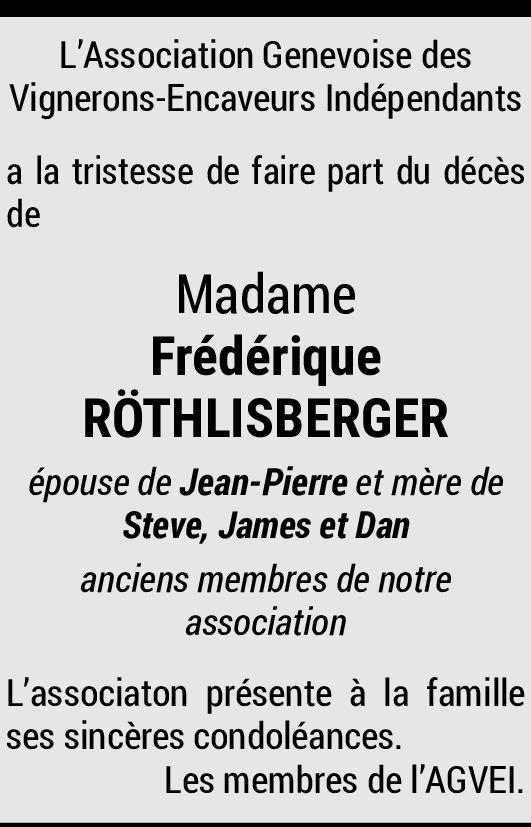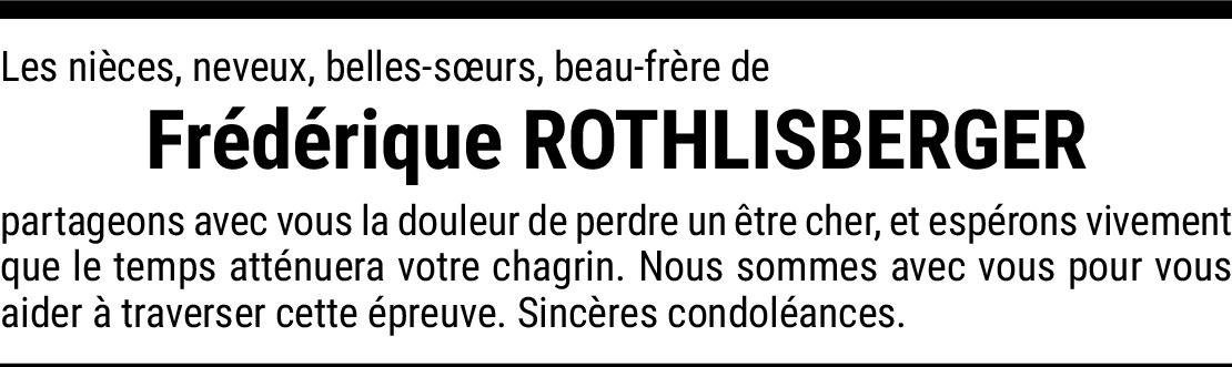 Sincères condoléances à la famille Rothlisberger et à Cathy pour la perte de notre cher voisine Frédérique. Lara et Julian