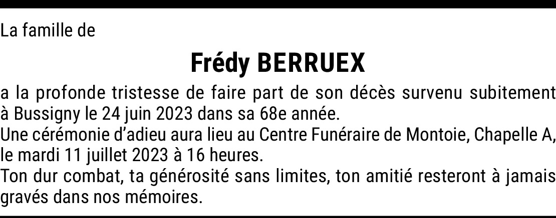 Cher Guillaume, Cher Luc, Chère Famille, je vous souhaite tout le courage nécessaire pour surmonter les moments difficiles de cette séparation. Perdre son papa, son grand-père, neveux, parent, ami ou camarade est un événement marquant et toujours durement ressenti. De précieux souvenirs surgissent et le chagrin nous prend le cœur et fait monter nos larmes. Mais la douleur d’avoir perdu Frédéric (Frédy) ne doit pas nous faire oublier la joie de l’avoir connu. Intelligent, bienveillant, philosophe, il aimait ses enfants, sa sœur, ses tantes, ses petits-enfants, sa famille et ses amis. Il a quitté ce monde pour naître au ciel. Nous le regrettons et penserons à lui avec nos meilleurs souvenirs. Avec mes sincères condoléances et mes sentiments profonds. Amitiés - Catherine