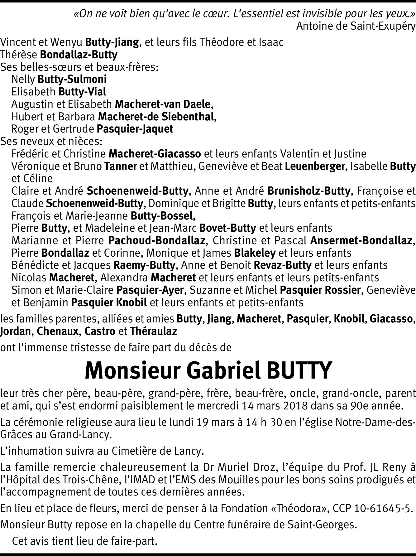 Vor mehr als 4 Jahren Melden J'ai connu Gabriel Butty dans les années 1966 et 1967 à l'Université de Genève, Faculté des sciences économiques et sociales. Je garde un souvenir prégnant des échanges que j'ai eus alors avec lui. Et lui ai toujours gardé une grande estime. Von Jean-Marc BARTHASSAT-LEE
