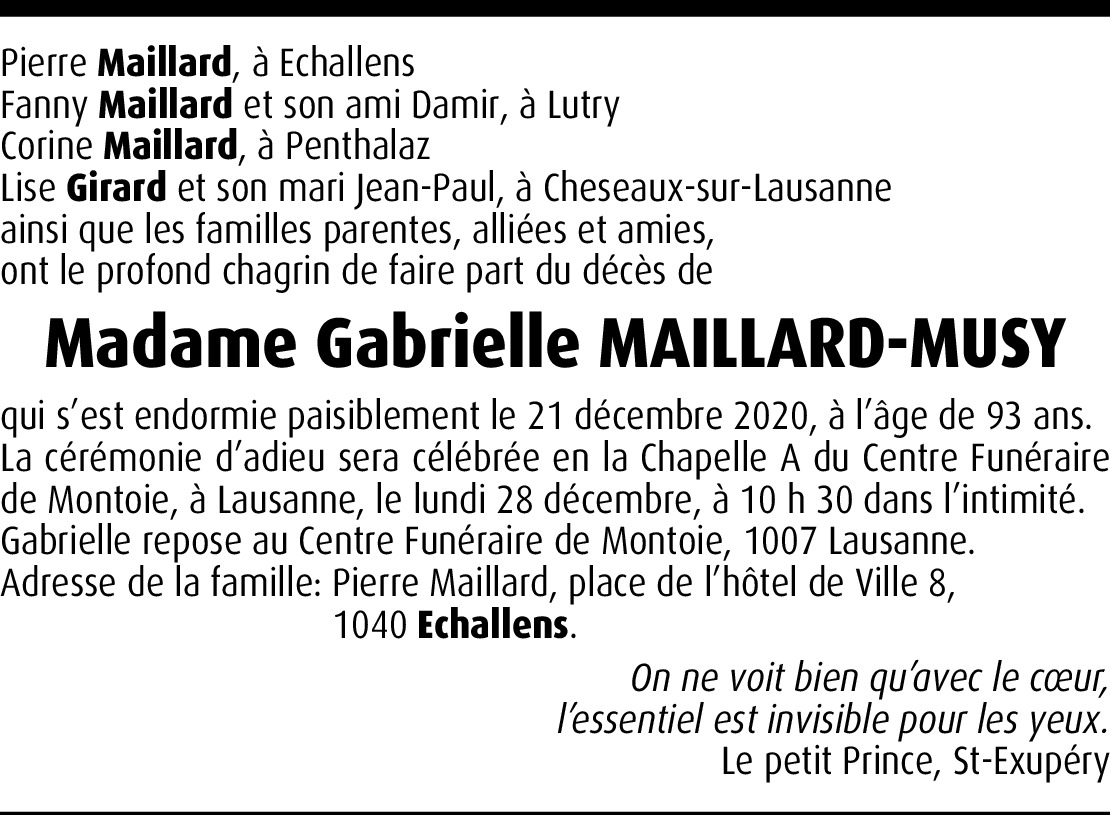 Vor mehr als 4 Jahren Melden Sincères condoléances Lise! Madame Gaillard était extraordinaire, je n'ai pas pu malheureusement la connaître longtemps à l'ems de Cheseaux. Je l'appréciais beaucoup. Qu'elle repose en paix. Fabienne Belet Von Fabienne Belet