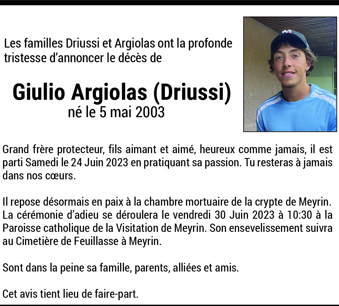 29.06.2023 Melden Sincères condoléances à la famille de Giulio, très gentil garçon, ami de mes enfants. Paix à ton âme Nadia L Von Lazaar