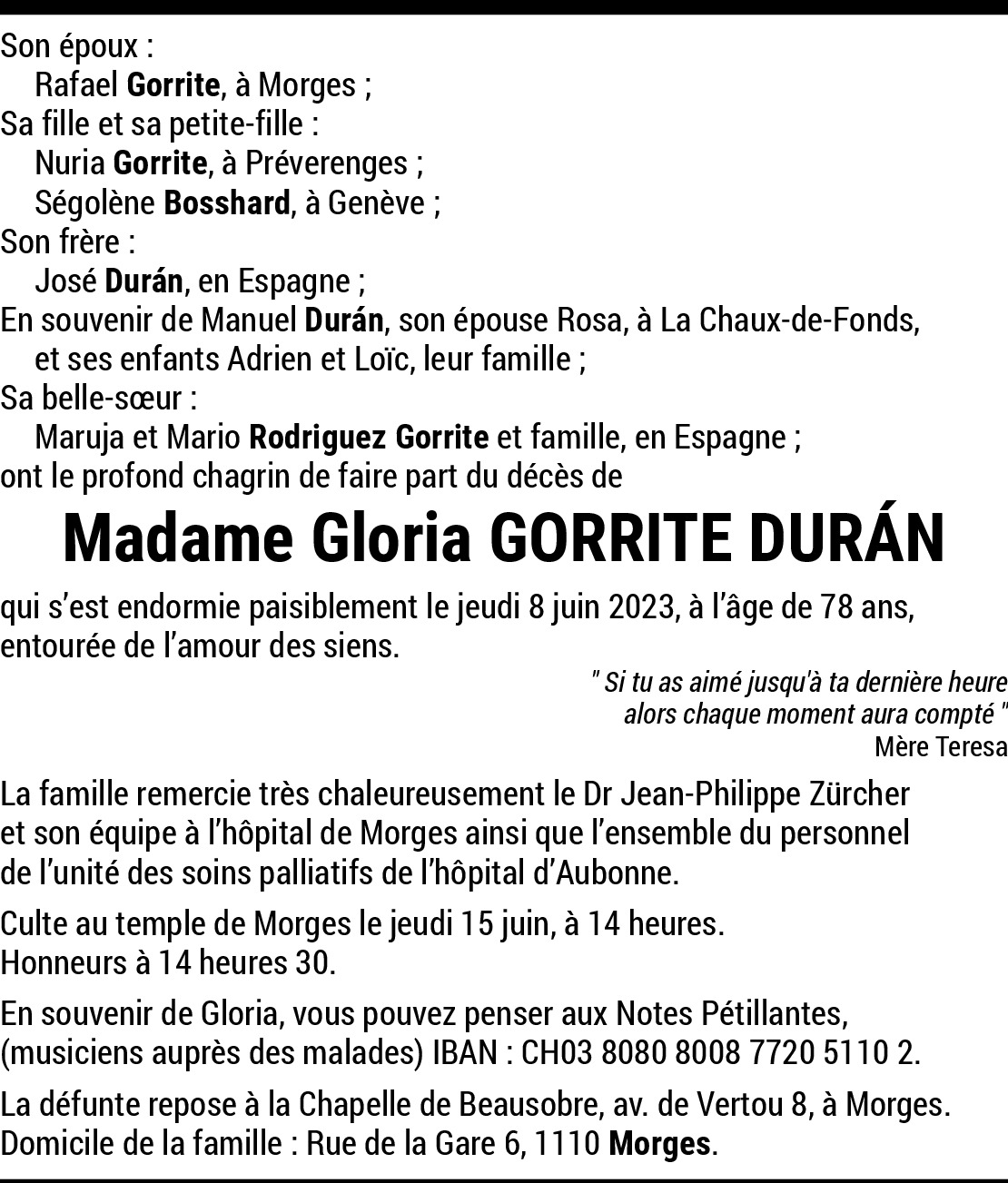 Gloria, tu étais une très belle personne, tu es partie rejoindre ta voisine et amie, maintenant vous allez vous revoir et prendre l’apéro de temps en temps, comme vous le faisiez avec vos époux.