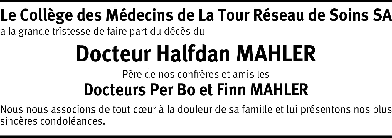 Halfdan Mahler – avec lui nous perdons un homme de valeur, un homme de courage, un humaniste. Un homme qui a ouvert de nouveaux horizons. Un médecin qui a su faire comprendre que la santé va au-delà du bien-être physique, que pour promouvoir la santé il faut plus que le seul acte médical, qui a su reconnaître ce qui est essentiel pour assurer la santé aussi pour les plus défavorisés. Les soins de santé de base, les médicaments essentiels, la promotion de l’allaitement maternel, pour ne nommer que ces trois éléments parmi d’autres, jamais ils n’auraient pu acquérir la force qui les habite sans Halfdan Mahler, sans sa détermination et son courage pour vaincre les résistances qui s’opposaient à sa vision et à son action. Résistances qui en partie ont prévalu par la suite, mais peut-être seulement en apparence – l’élan initial n’est pas étouffé. De tout cœur merci, Halfdan Mahler, grand merci.