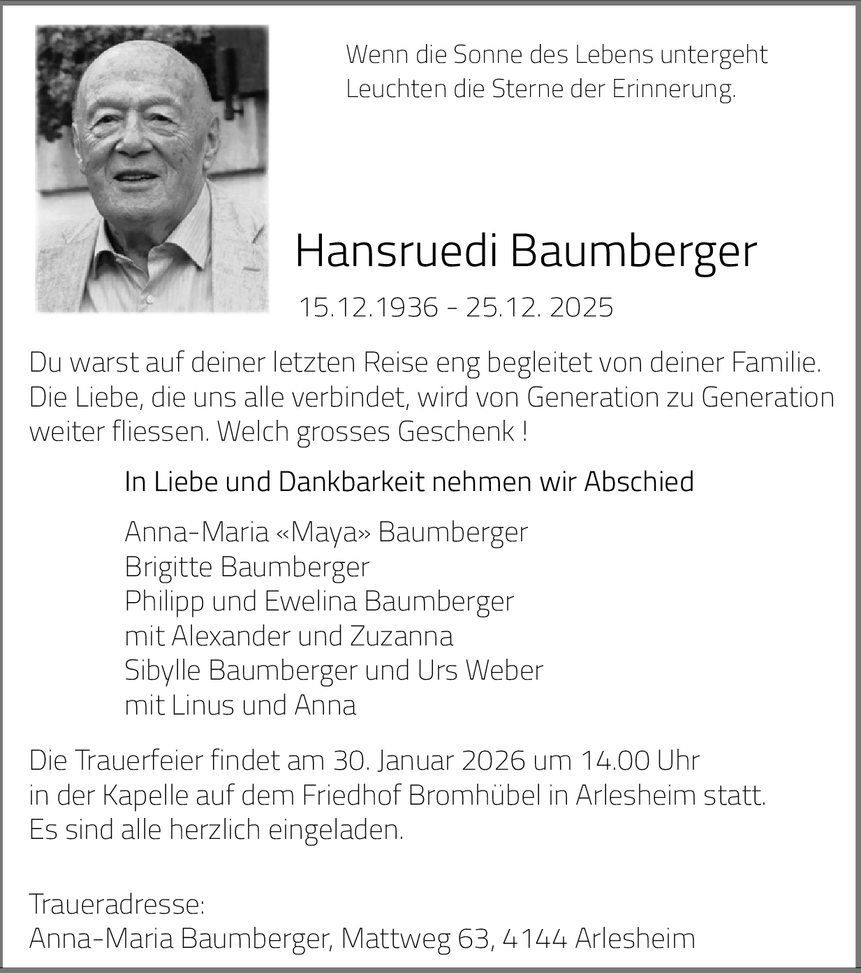 Wir wünschen den Hinterbliebenen für die Verabschiedung ihres geliebten Hansruedi und für die Zukunft viel Kraft.