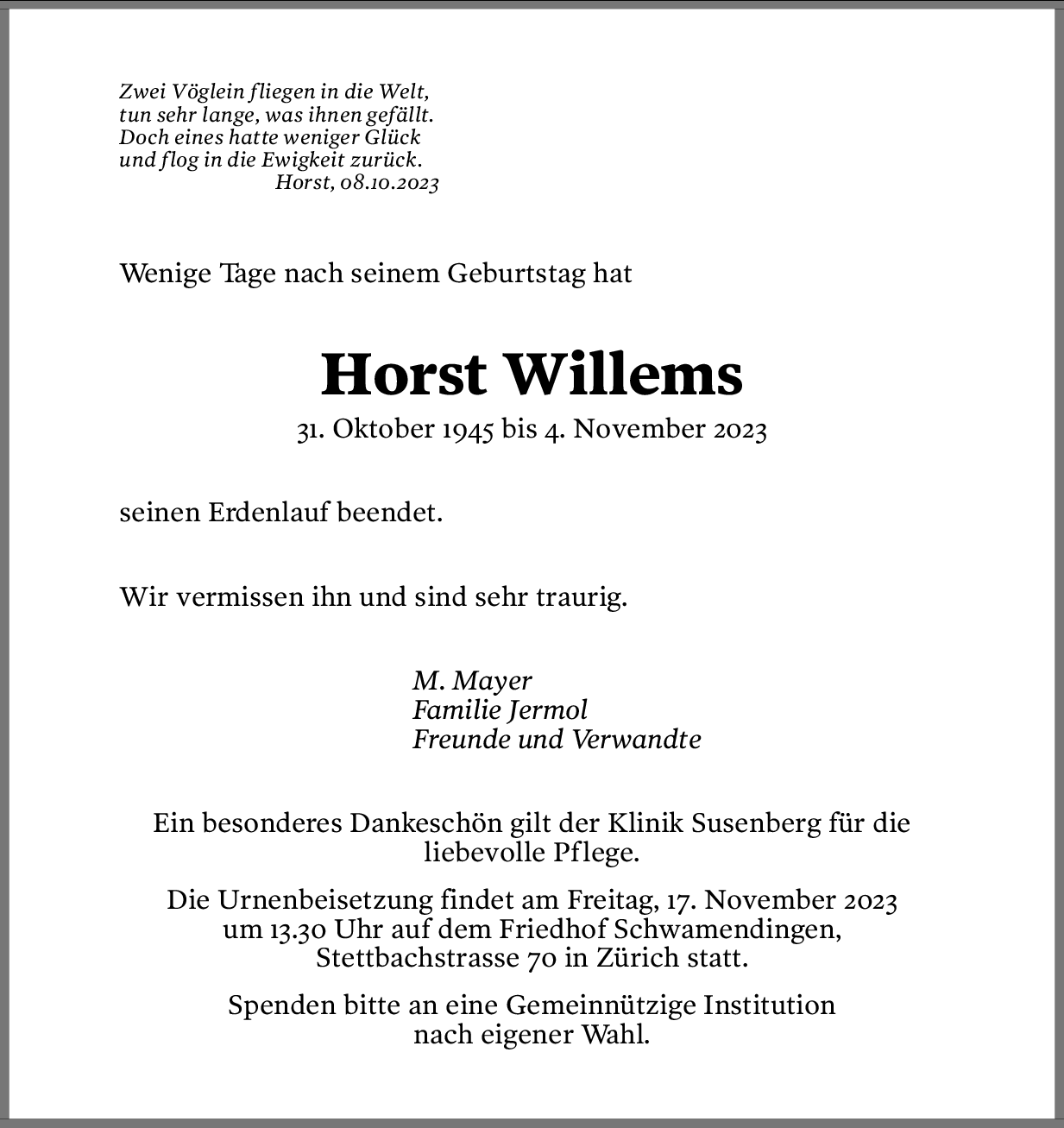 Möchten Sie über neue Todesanzeigen und Kondolenzen für diesen Verstorbenen informiert werden?