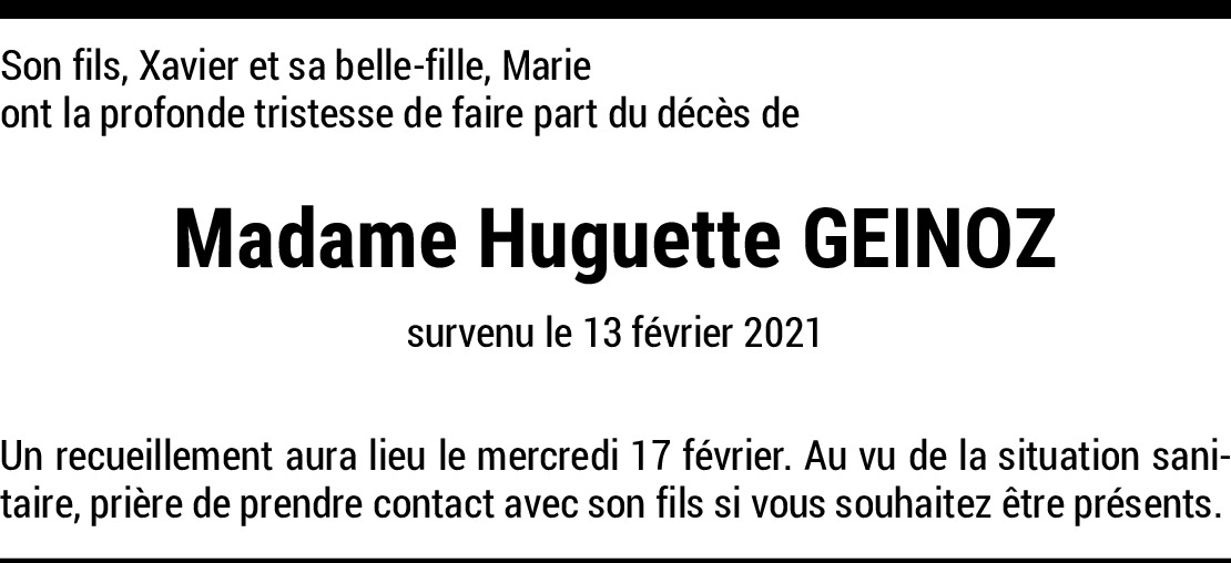 Vor mehr als 4 Jahren Melden En souvenir de notre ancienne collègue, recevez mes sincères condoléances. Repose en paix Huguette. Avec toute ma sympathie. Sylvie Panchaud Allemann Von Sylvie Panchaud Allemann