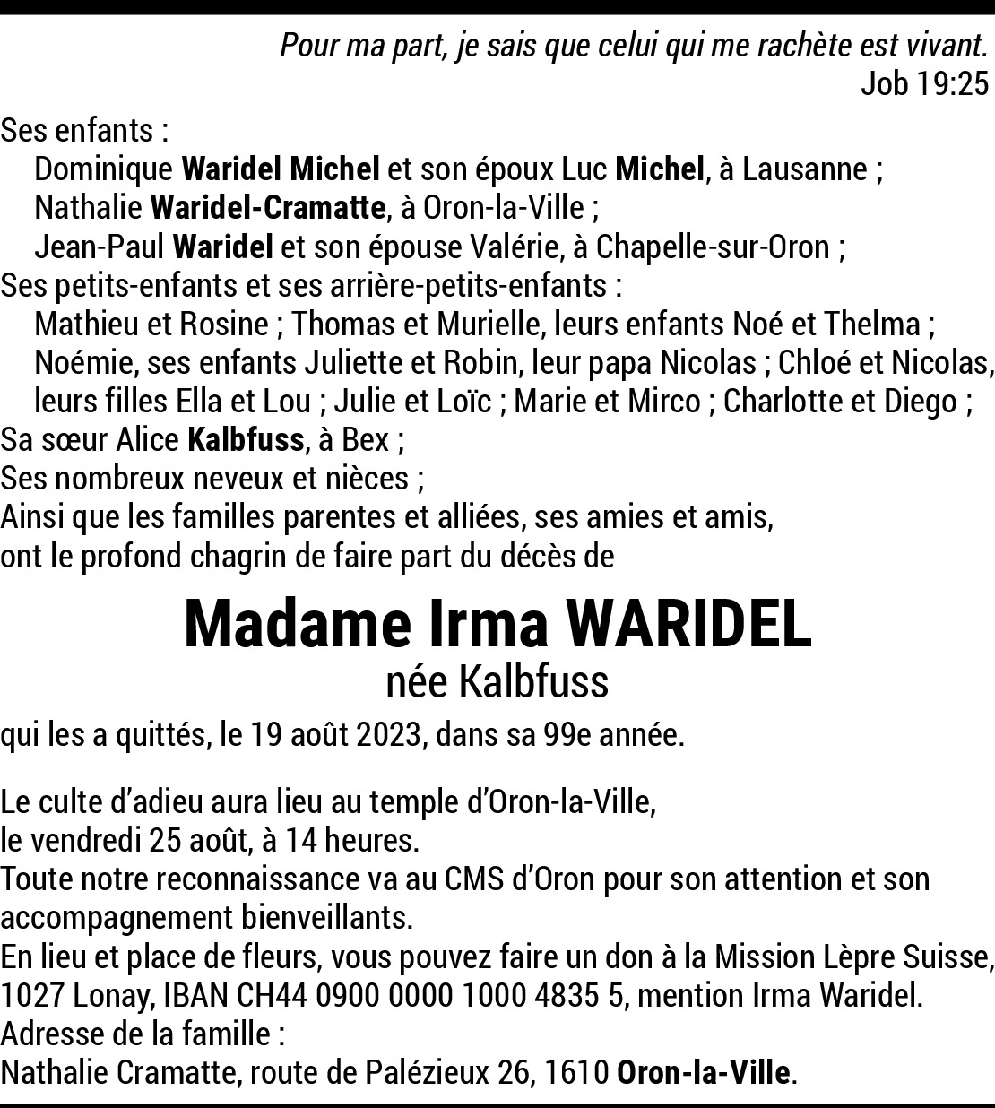 Très ému d'apprendre le décès de votre maman grand maman et arrière je vous envoie mes sincères condoléances. Elle fut ma maîtresse d'école enfantine à Oron et a toujours été une maîtresse très gentille et quand on la croisait plus tard à Oron elle avait toujours un mot gentil et le plaisir de nous revoir et réciproquement. Reposez en paix 🙏
