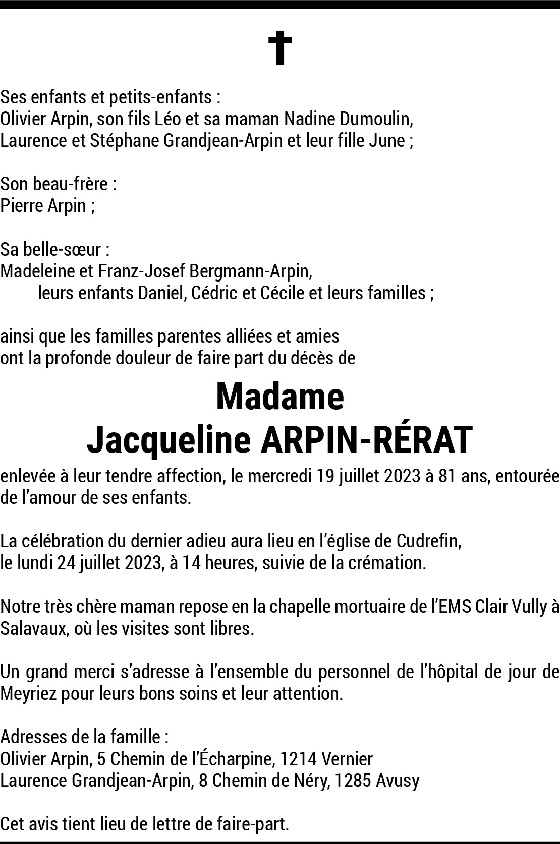 Et soudain un piano se tut.. Celui qui rythmait nos années 80, au delà d'un balcon blanc, du rire d'enfants et qui embrassait le soleil clair et orangé de l'Esplanade, à Vernier. Madame Arpin, vous faisiez partie de mon album d'enfance, de nos printemps fêtés autour de bougies d'anniversaire et des pavés accueillants de notre village tant aimé. Je me souviens de vos cadeaux offerts sous le marronnier de l'Etoile dans la caresse d'un soleil bleu, de votre tendre gentillesse et du rôle de maman qui vous enveloppait à la perfection. Je vous souhaite le repos de l'âme, la paix du paradis et pour toujours, notre souvenir bienveillant. Sincèrement et affection à Olivier et Laurence. Sandra Chaulmontet